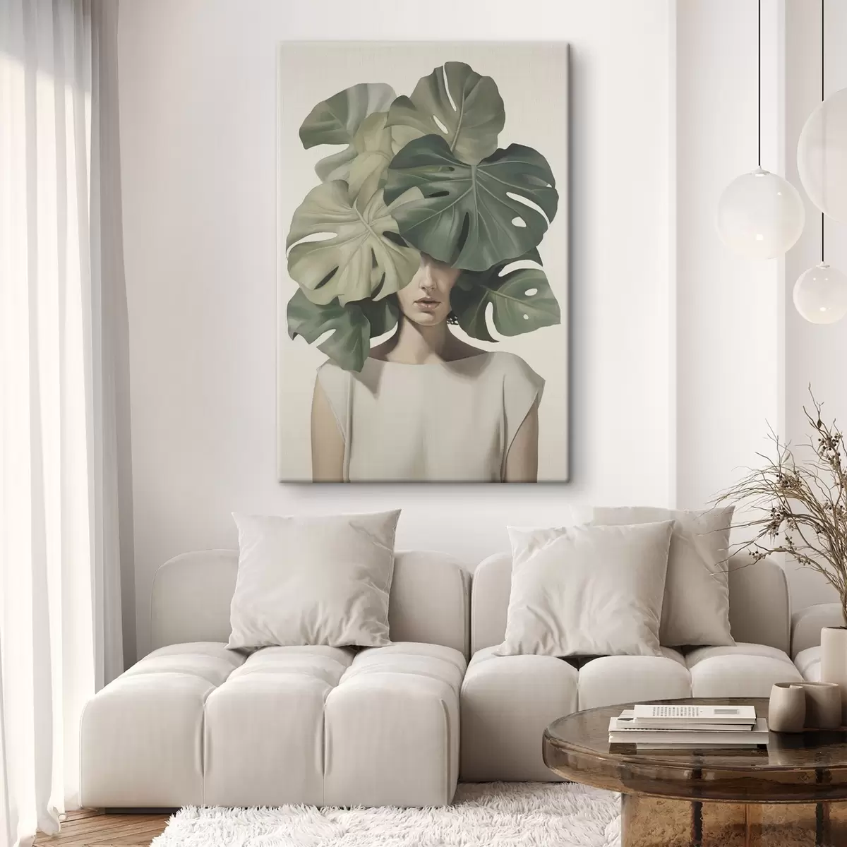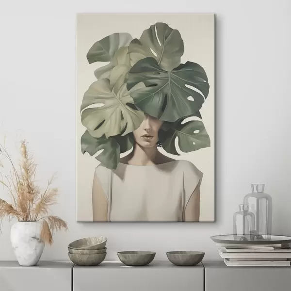 Wandbilder Abstraktes Porträt eines Mädchens mit Monstera-Blättern Art. s47336