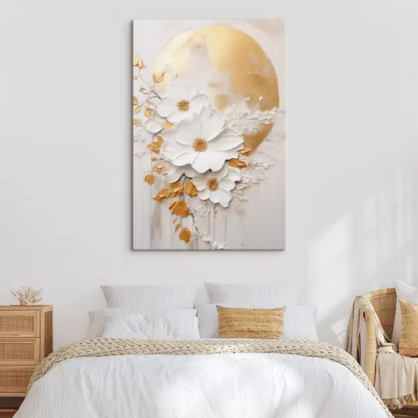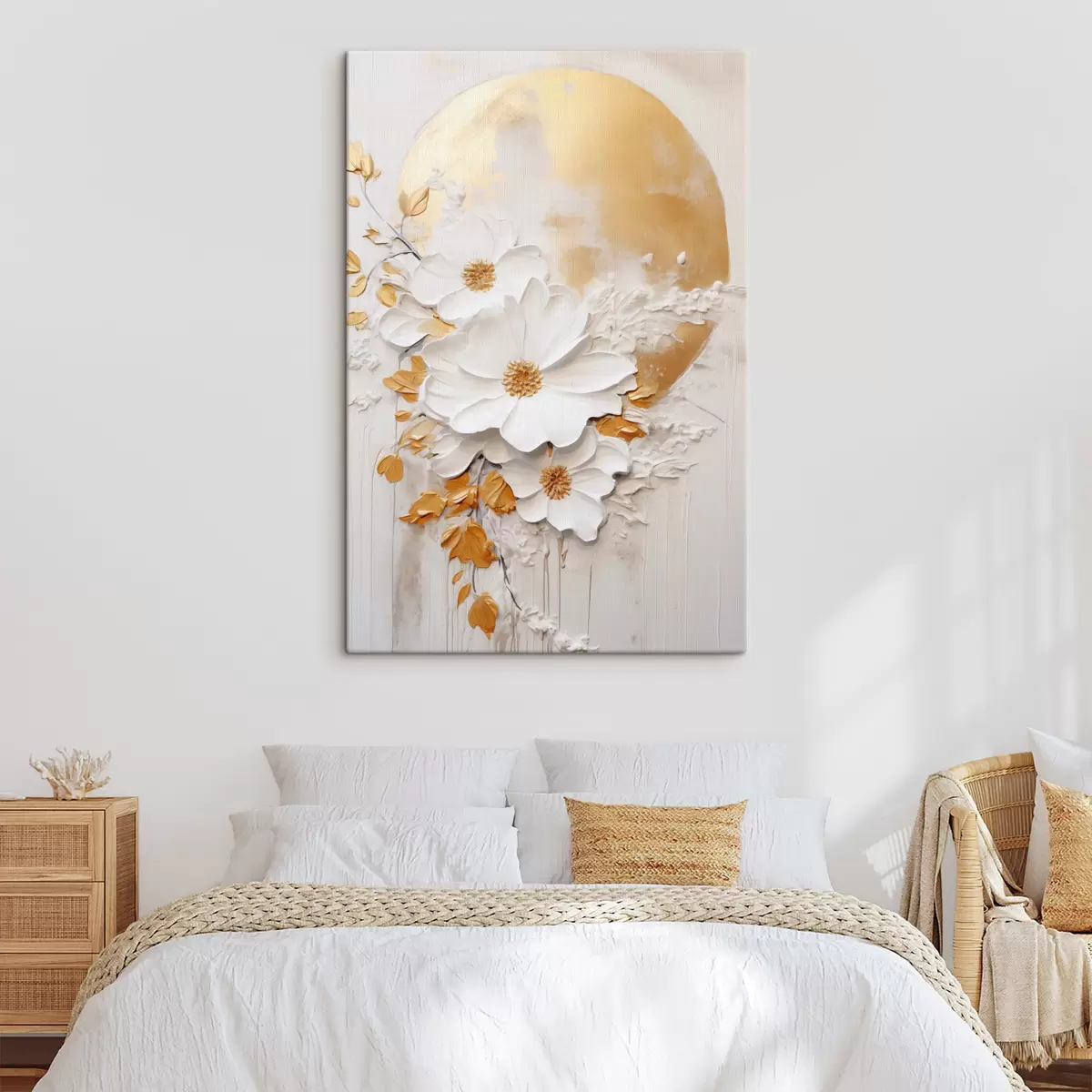 Wandbilder Weiße Blumen mit gelben Akzenten und zarten Blättern vor einem strukturierten Hintergrund, moderne Kunst s47414