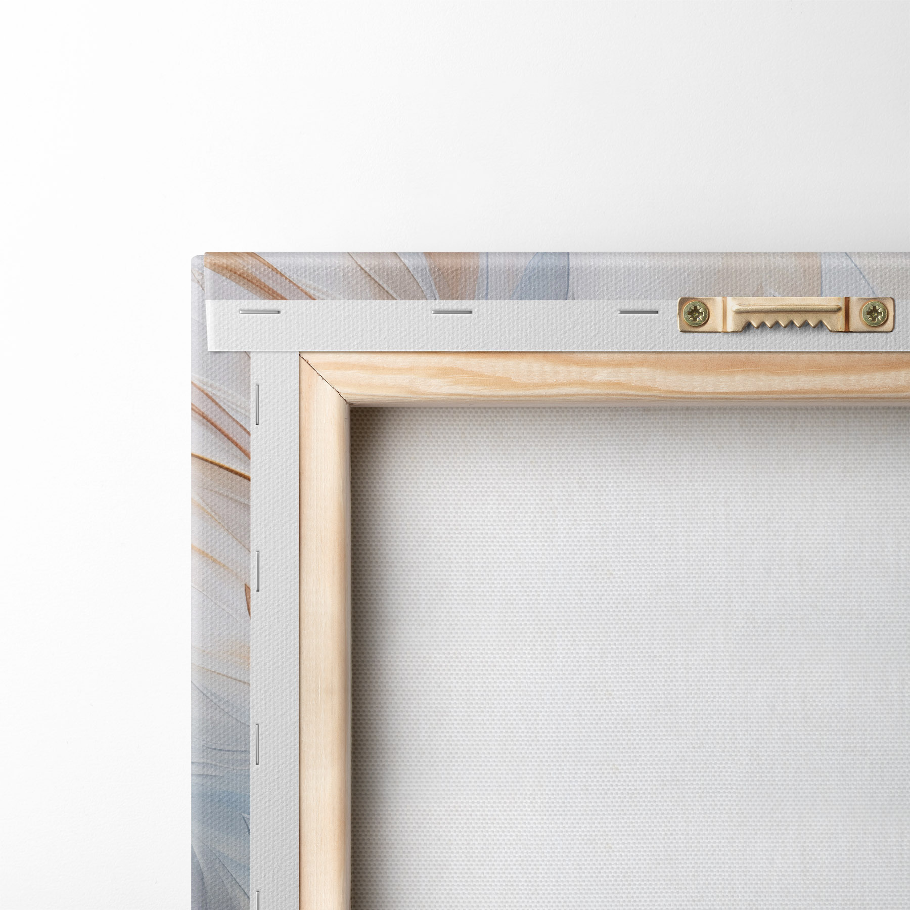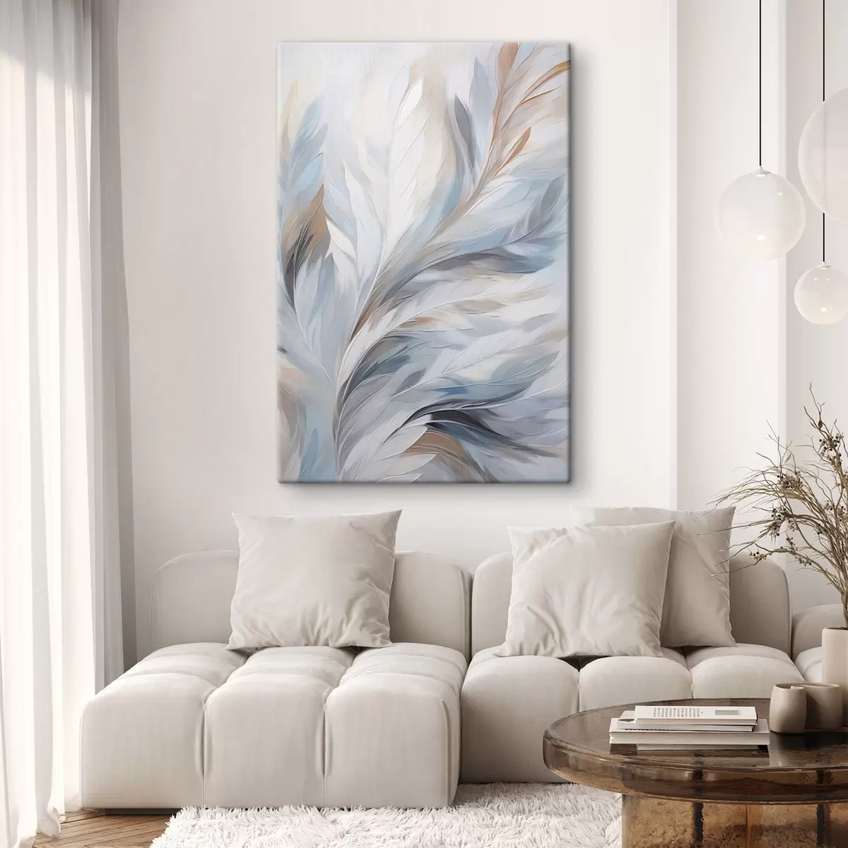Wandbilder Zarte hellblaue und braune Federn mit einer weichen, ätherischen Textur vor einem weißen Hintergrund Art. s47416