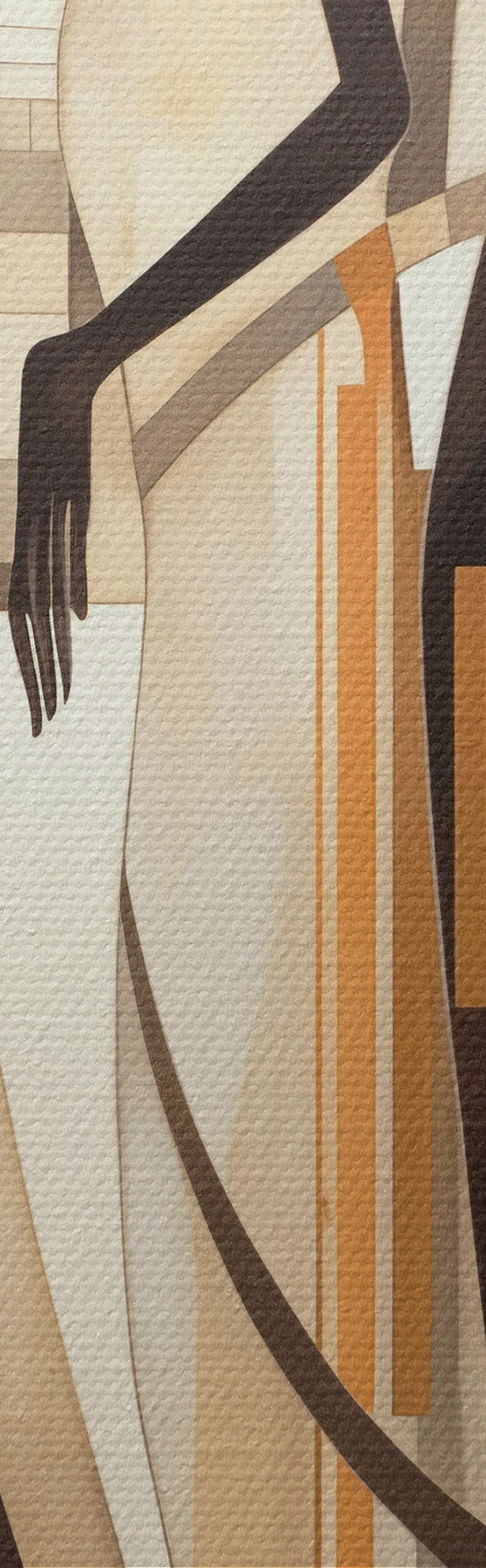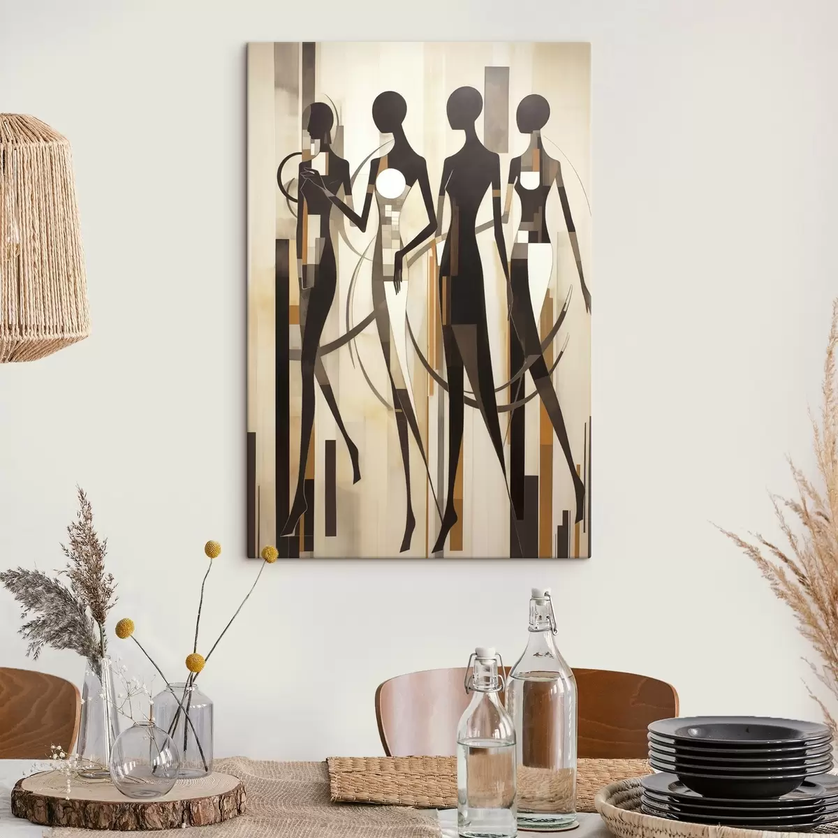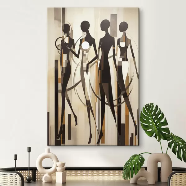Wandbilder Stilisierte weibliche Figuren mit geometrischen Elementen vor einem abstrakten Hintergrund aus vertikalen Linien Art. s47423