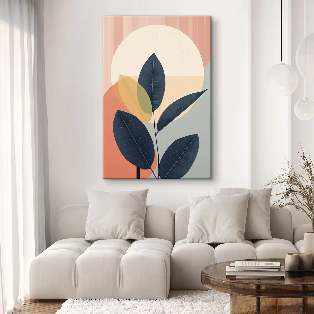 Wandbilder Dunkle Blätter vor einem Hintergrund aus abstrakten Formen in Pfirsich und Grau mit einem großen, hellgelben Kreis s47424