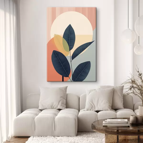Wandbilder Dunkle Blätter vor einem Hintergrund aus abstrakten Formen in Pfirsich und Grau mit einem großen, hellgelben Kreis Art. s47424