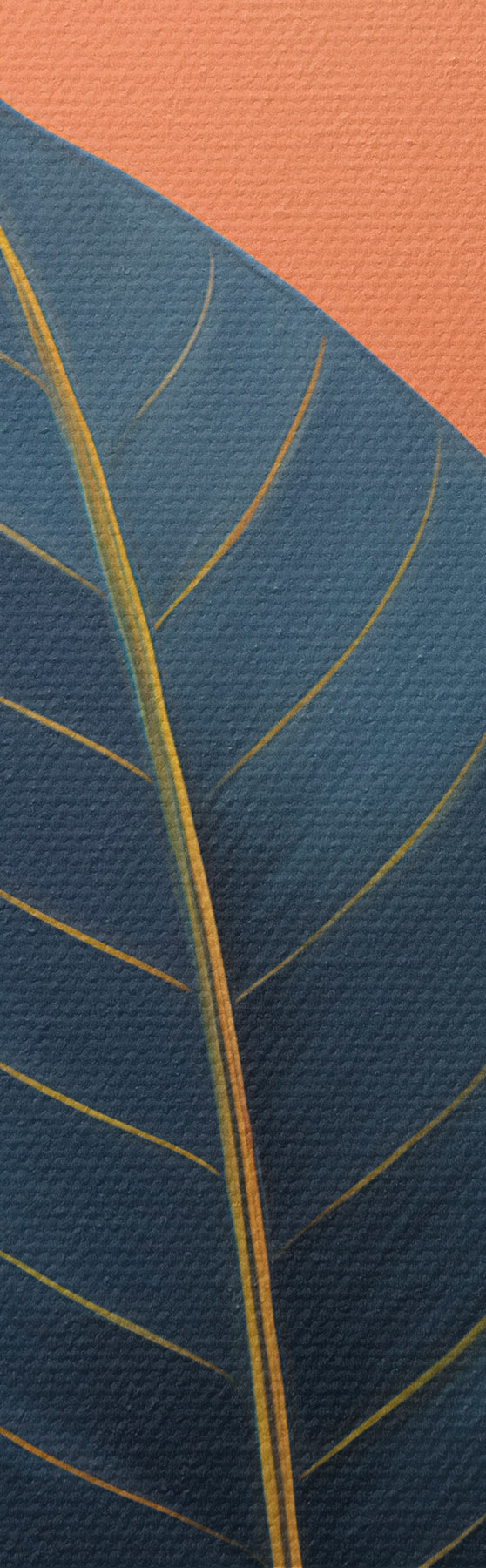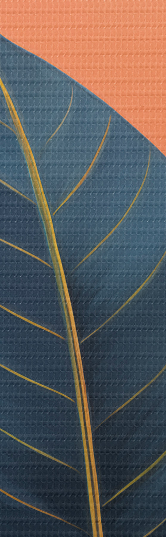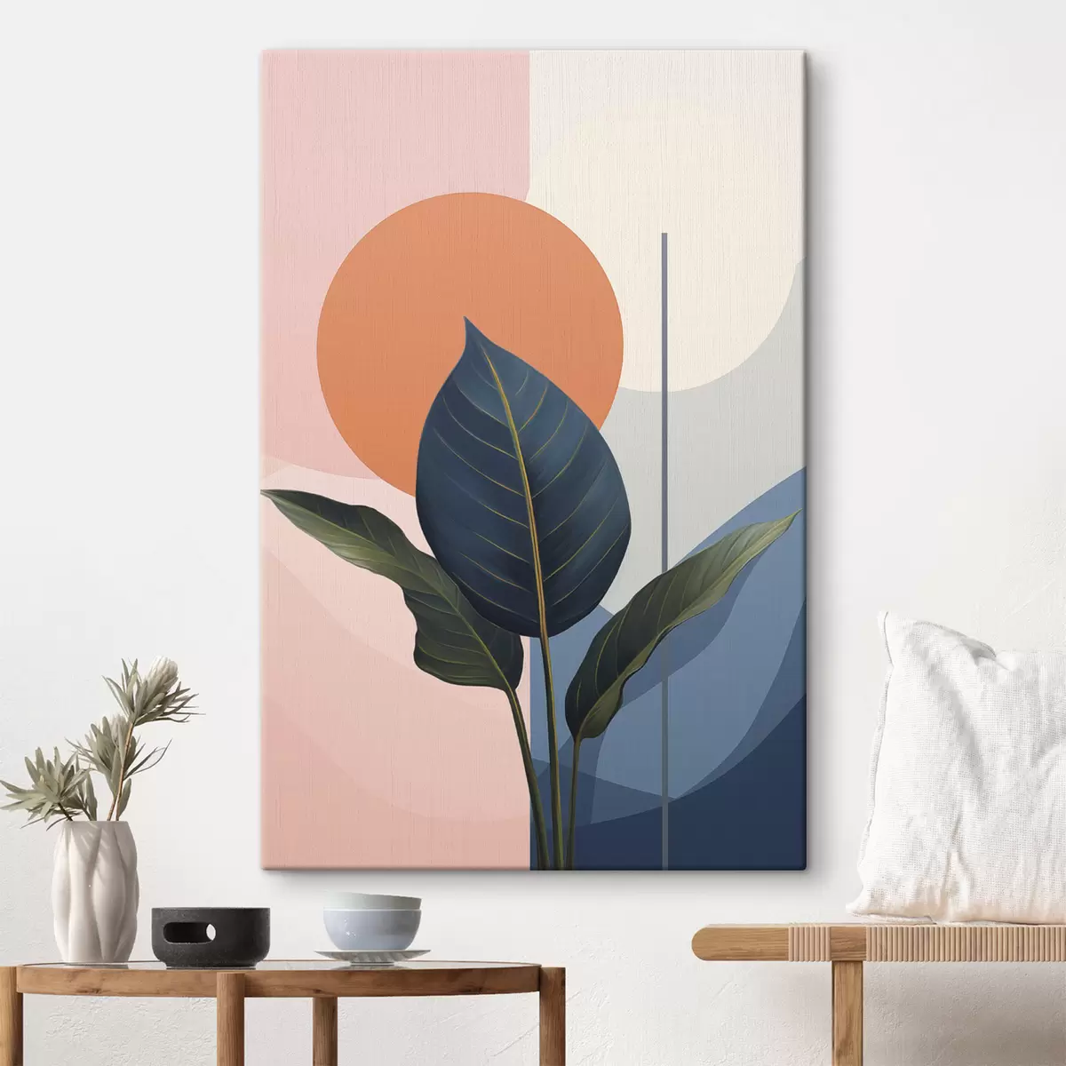 Wandbilder Dunkle Blätter vor einem Hintergrund aus abstrakten Formen in Pfirsich und Grau mit orangefarbenem Kreis s47425