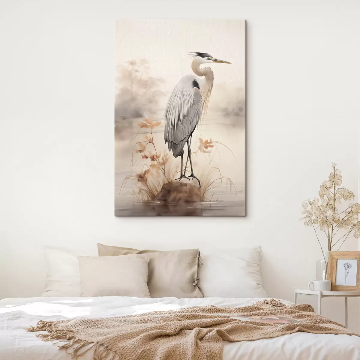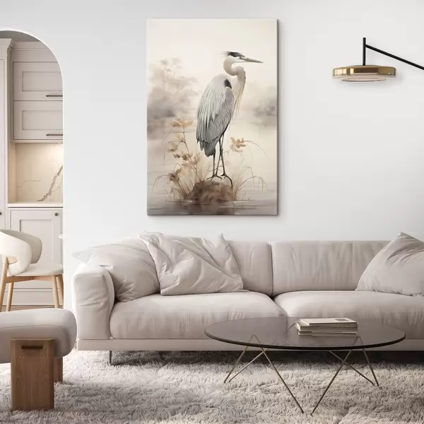 Wandbilder Ein Reiher steht auf einem Felsen in einem See, im Hintergrund hohe Gräser und Bäume. Art. s47426