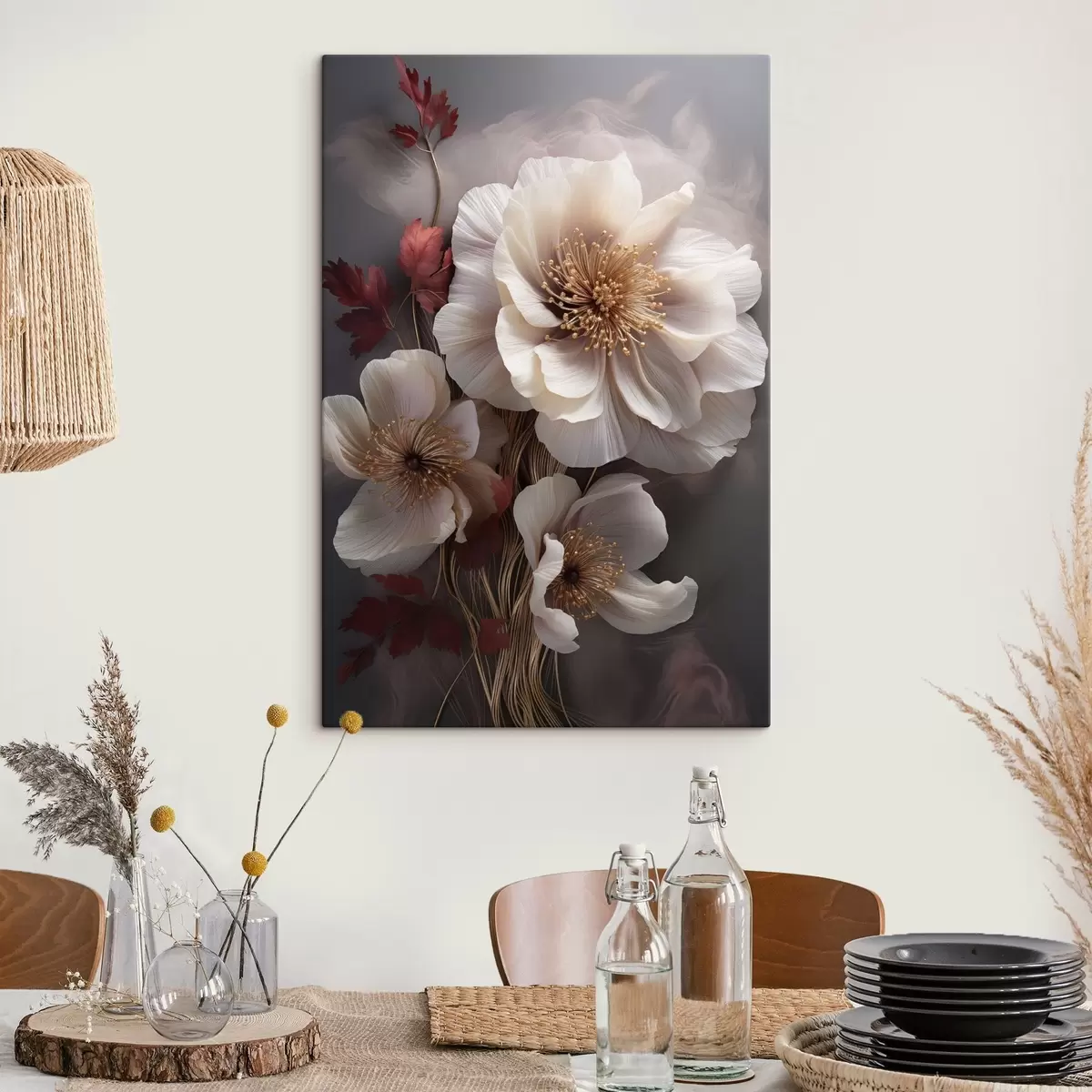 Wandbilder Zarte Pfingstrosen mit dünnen, zarten Blütenblättern, umgeben von dunkelroten Blättern vor einem abstrakten Hintergrund s47434