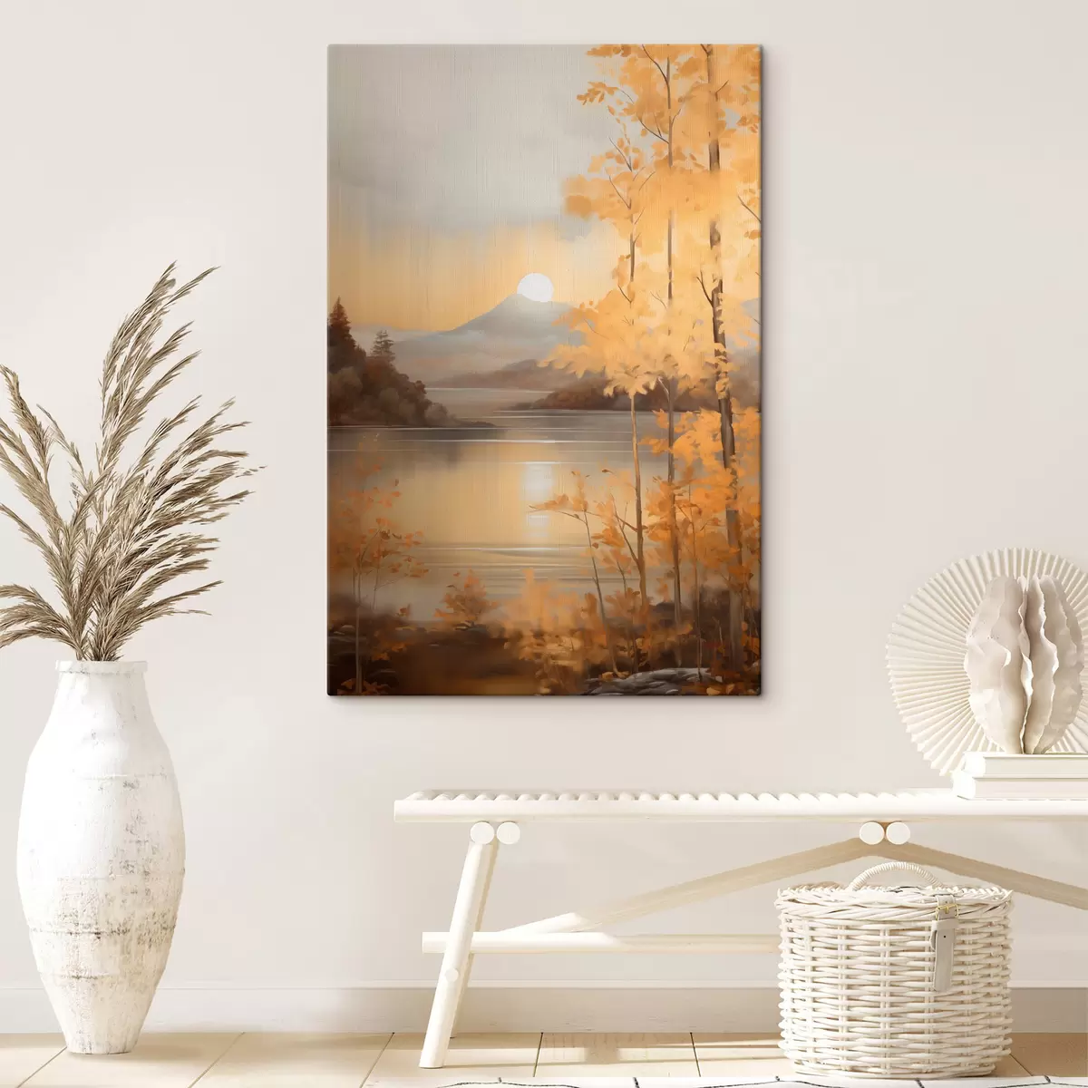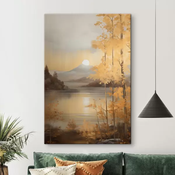 Wandbilder Herbstliche Bäume mit orangefarbenen Blättern umrahmen einen ruhigen See mit fernen Bergen unter einem bewölkten Himmel. Art. s47440