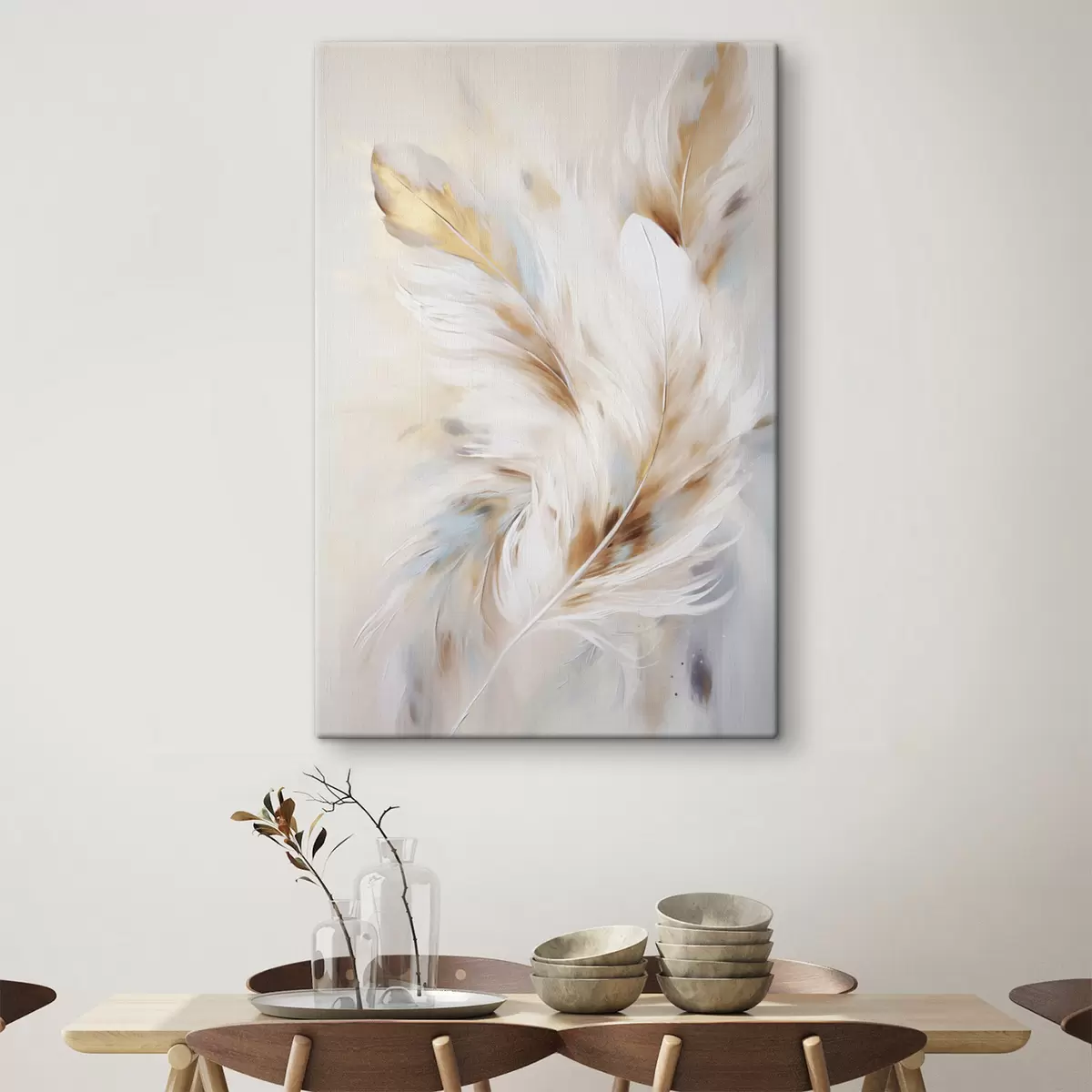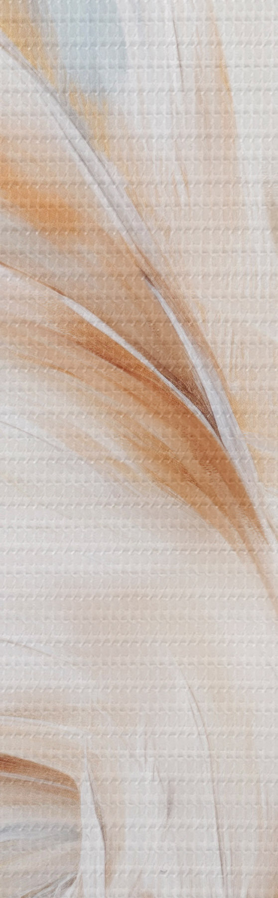 Wandbilder Große, weiche Federn in einer Mischung aus Weiß-, Gelb- und Brauntönen vor einem hellen, abstrakten Hintergrund Art. s47442