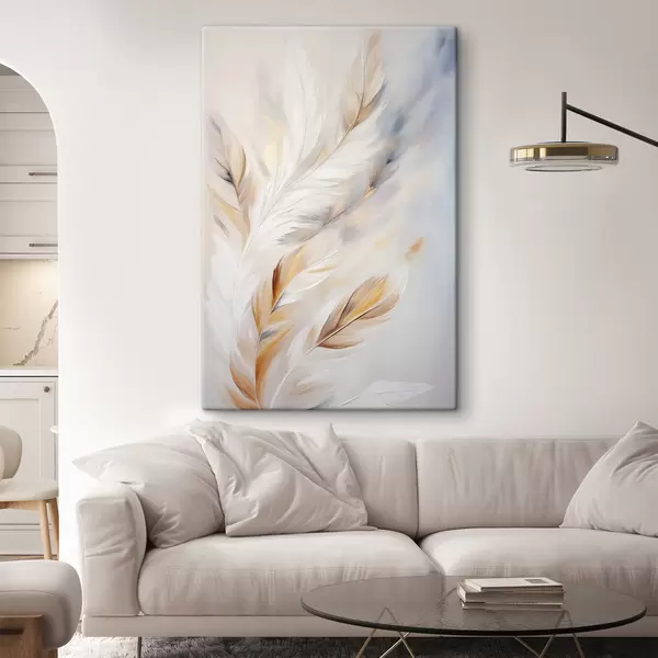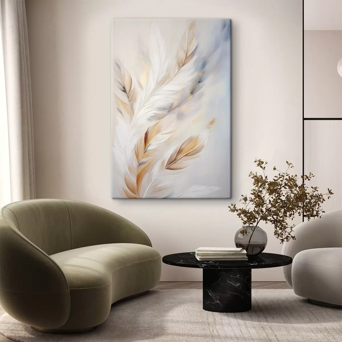 Wandbilder Große, weiche Federn in einer Mischung aus Weiß-, Gelb- und Brauntönen vor einem hellen, abstrakten Hintergrund Art. s47443
