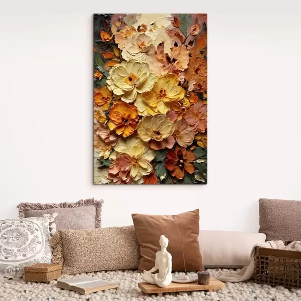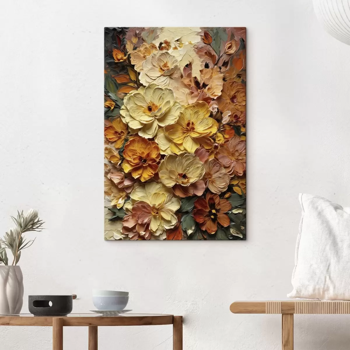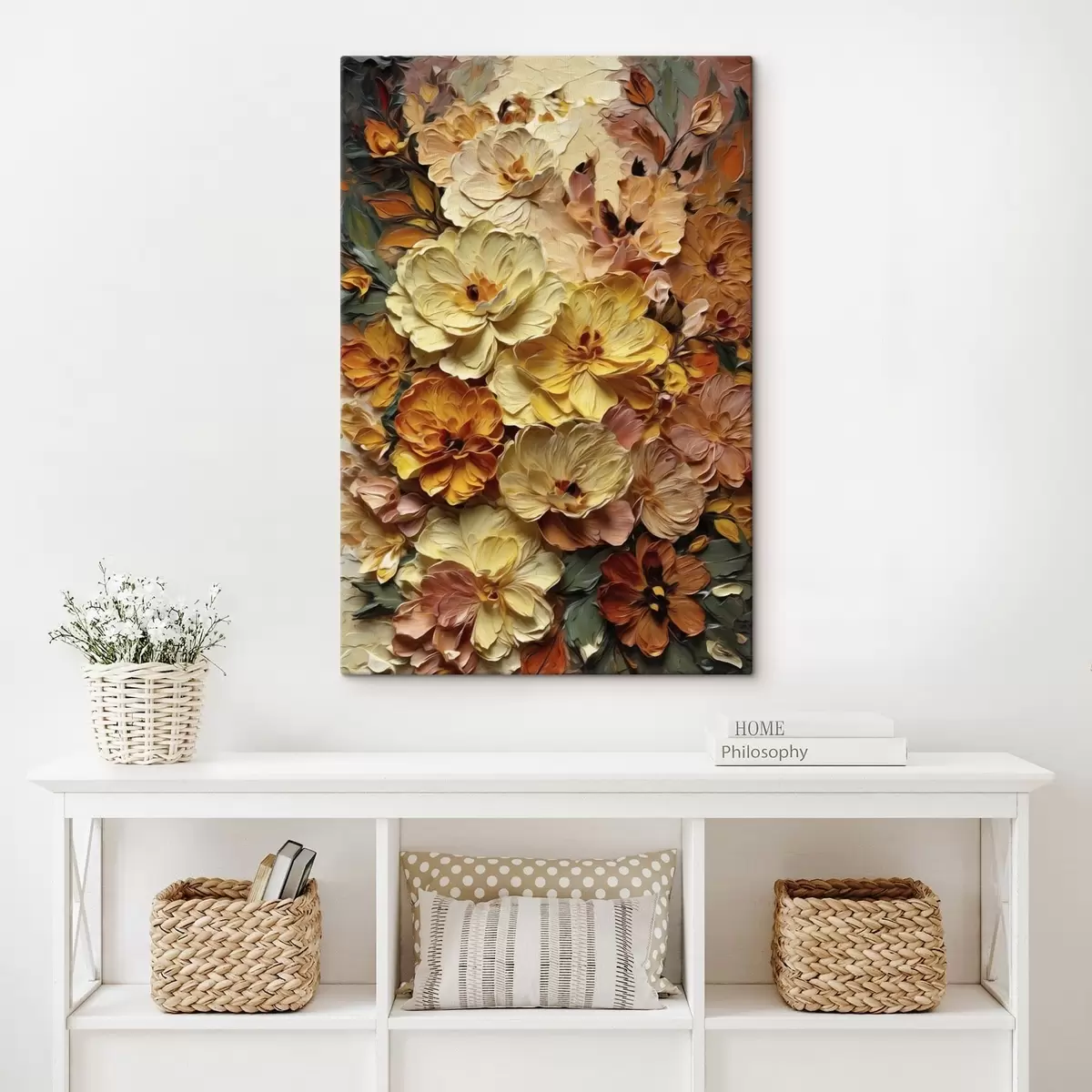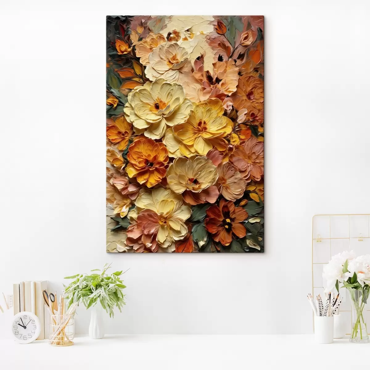 Wandbilder Üppige Komposition aus leuchtenden Blumen in warmen Farbtönen Art. s47760