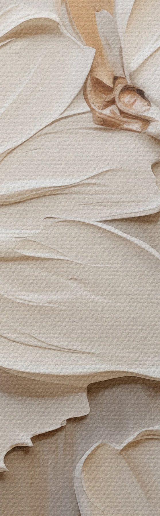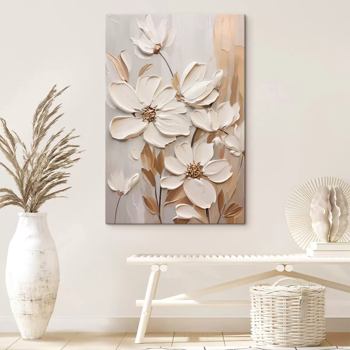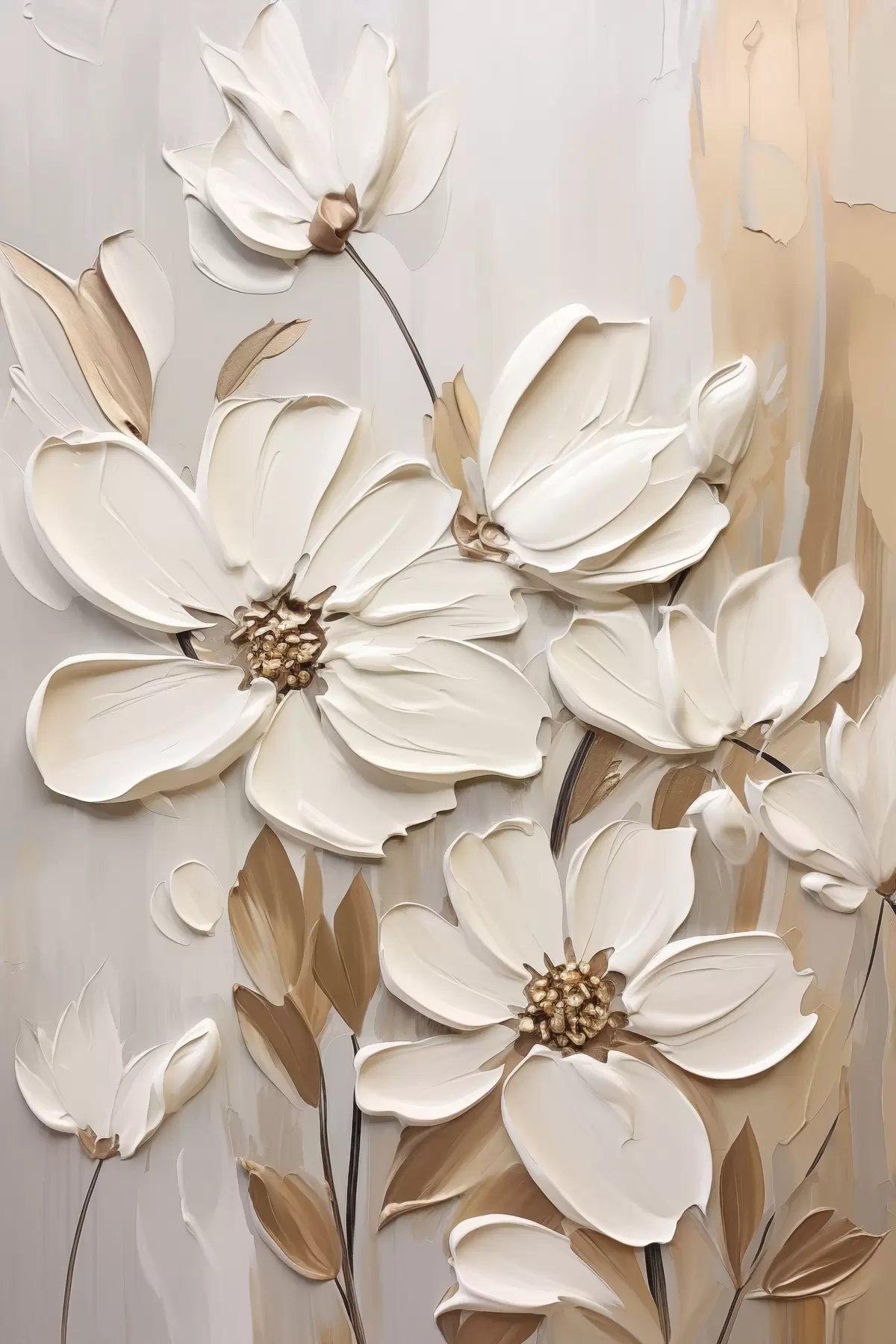 Wandbilder Abstrakte weiße Blumen mit strukturierten Blütenblättern vor einem neutralen Hintergrund mit subtilen Pinselstrichen. s47873