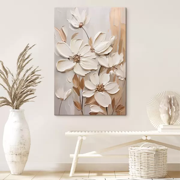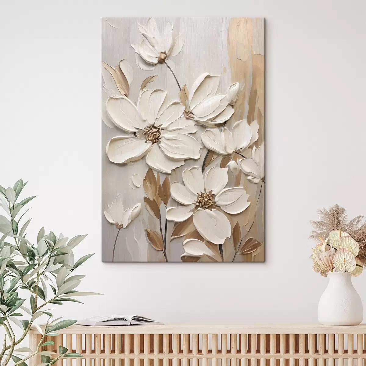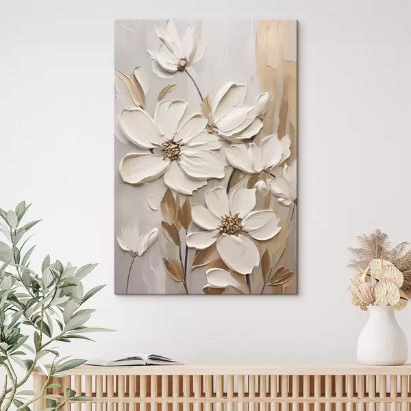 Wandbilder Abstrakte weiße Blumen mit strukturierten Blütenblättern vor einem neutralen Hintergrund mit subtilen Pinselstrichen. Art. s47873