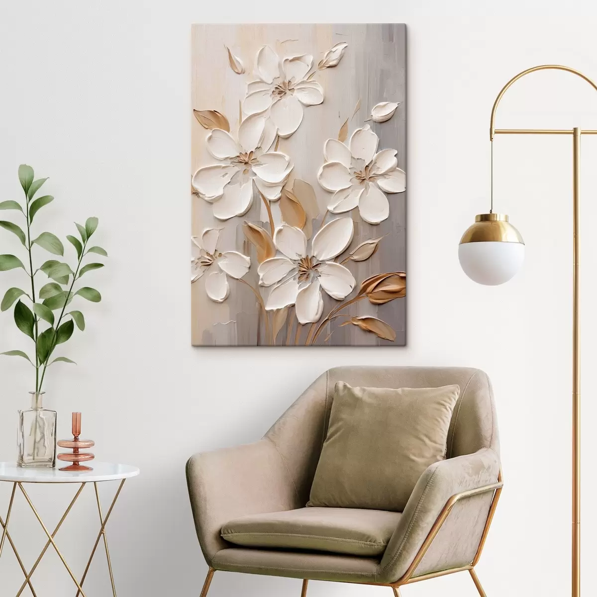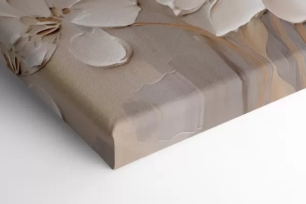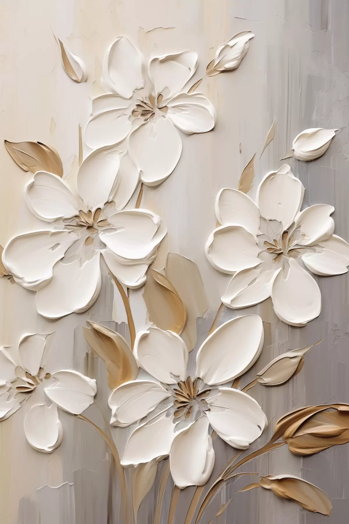 Wandbilder Abstrakte weiße Blumen mit strukturierten Blütenblättern vor einem neutralen Hintergrund mit subtilen Pinselstrichen. s47874