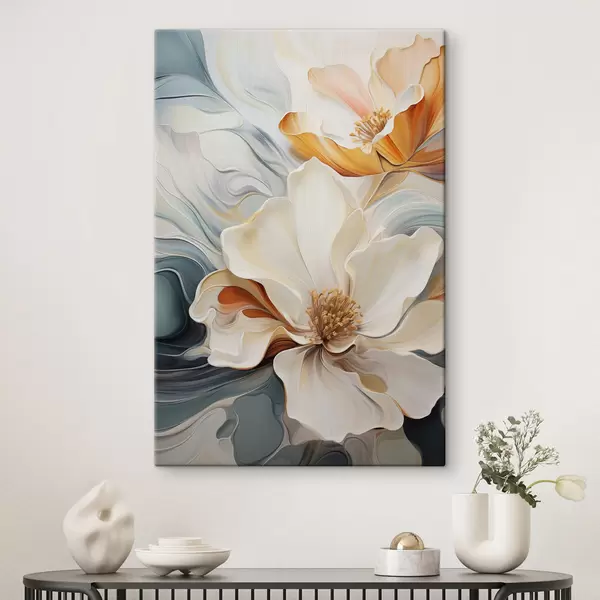 Wandbilder Abstrakte große Blume mit weißen, orangefarbenen und blaugrünen Blütenblättern, strukturierter Hintergrund Art. s47878