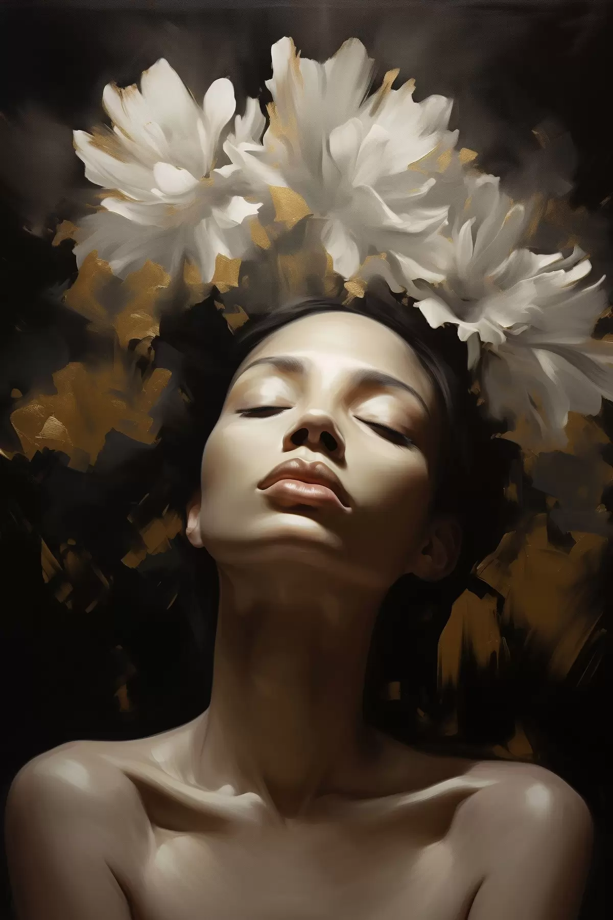 Wandbilder Weibliches Porträt mit weißen Blumen Art. s47918