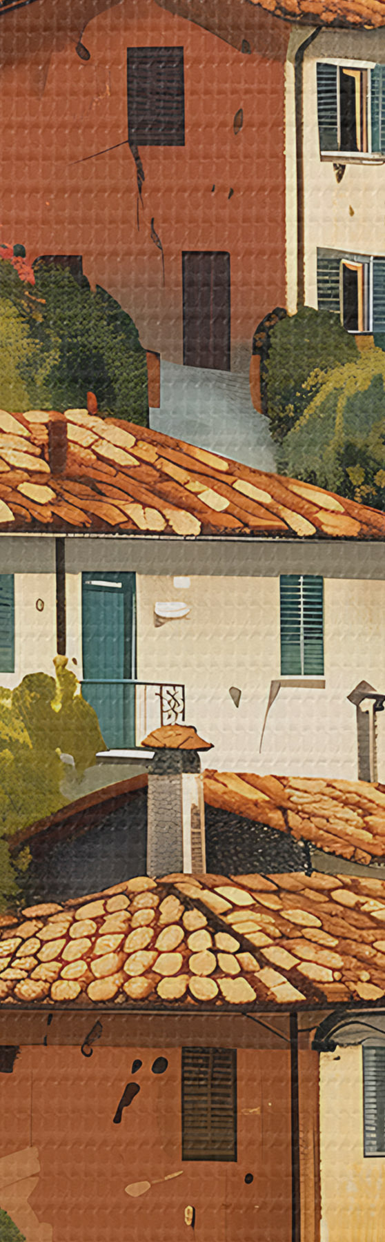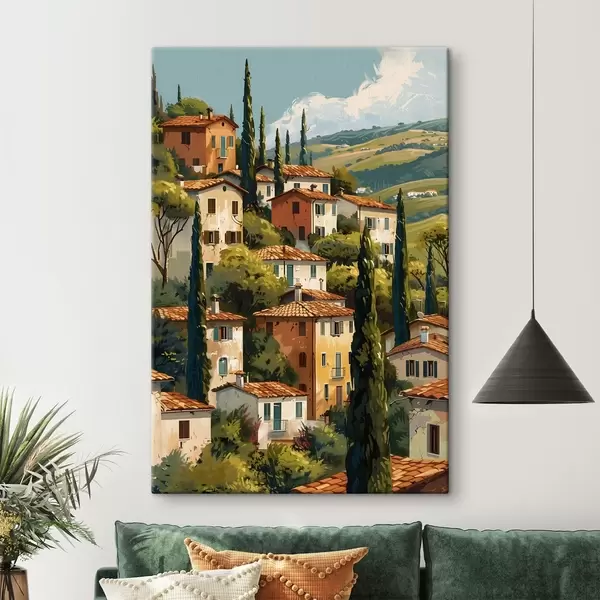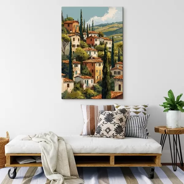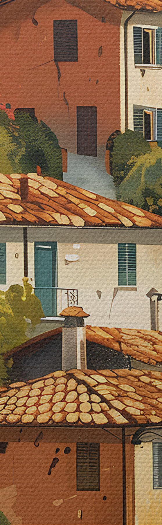 Wandbilder Mediterranes Bergdorf, übereinanderliegende Häuser in warmen Farbtönen mit Terrakottadächern s47950