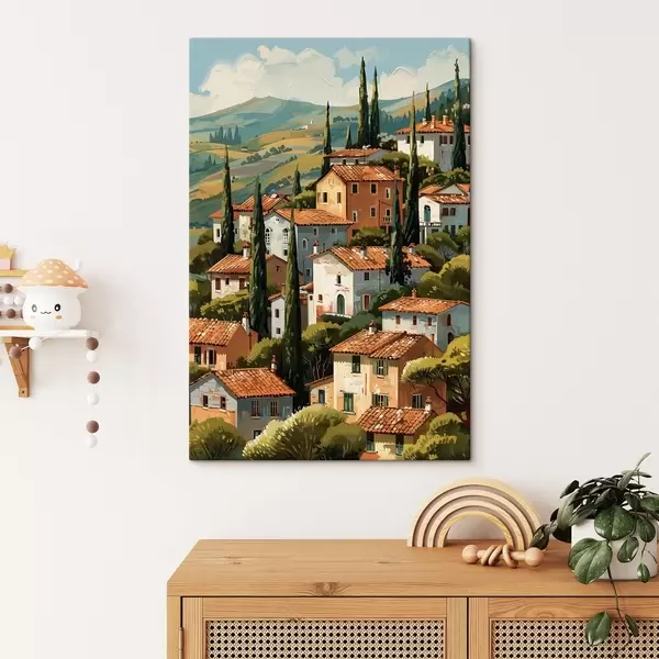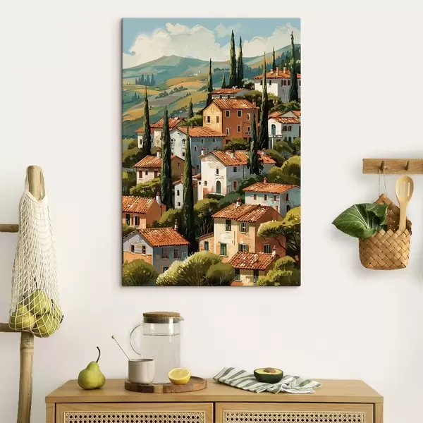 Wandbilder Mediterranes Bergdorf, übereinanderliegende Häuser in warmen Farbtönen mit Terrakottadächern Art. s47951