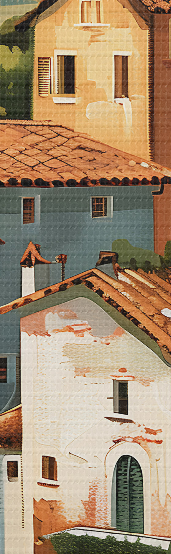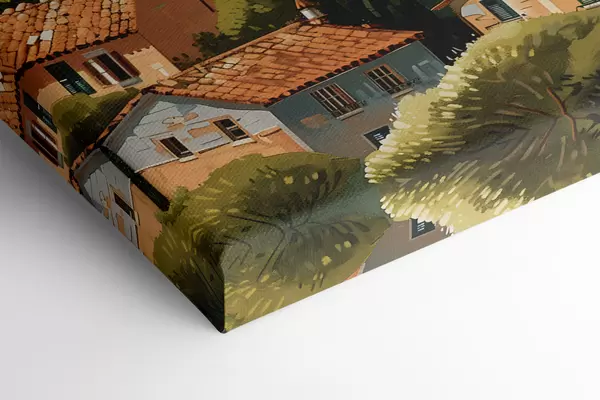 Wandbilder Mediterranes Bergdorf, übereinanderliegende Häuser in warmen Farbtönen mit Terrakottadächern s47951
