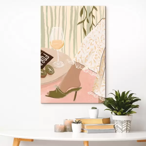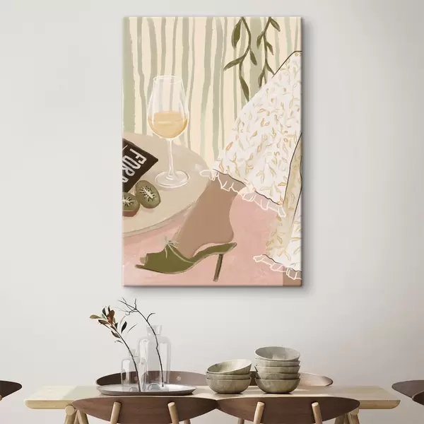 Wandbilder Tisch mit Weinglas und Kiwi neben Kleid Art. s48021