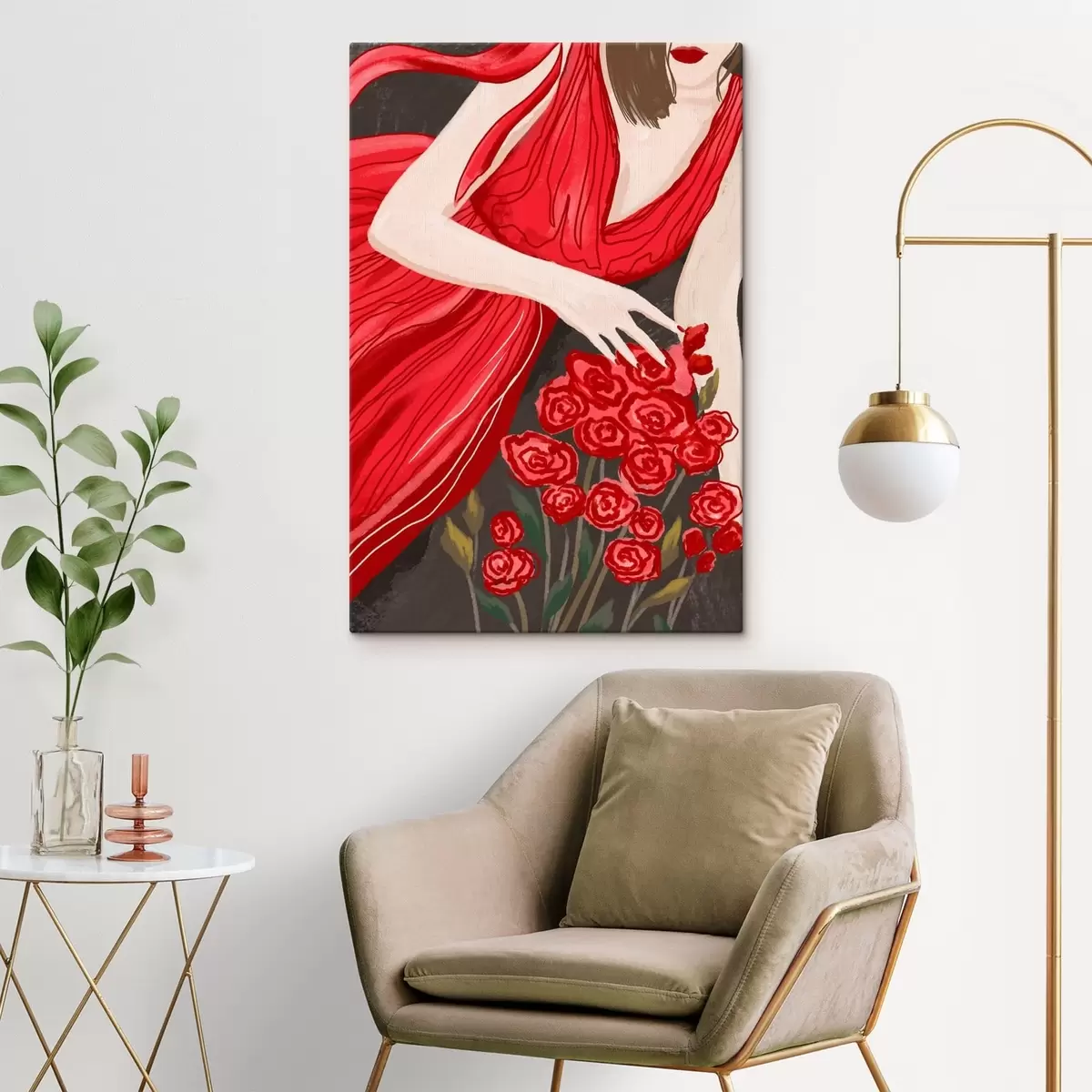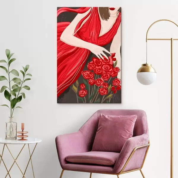 Wandbilder Frau in rotem Kleid mit Rosenstrauß Art. s48026