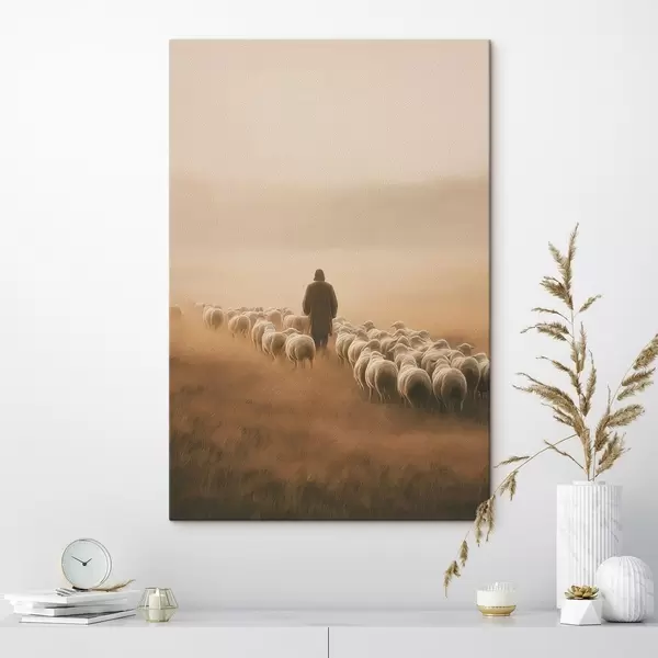 Wandbilder Hirte, der mit seiner Schafherde auf einer offenen Weide spazieren geht s48077