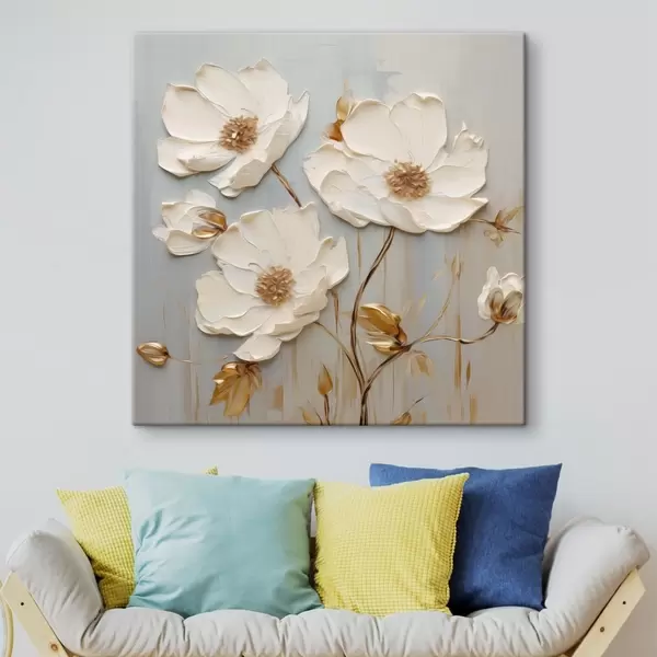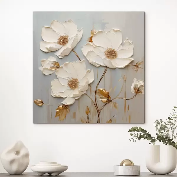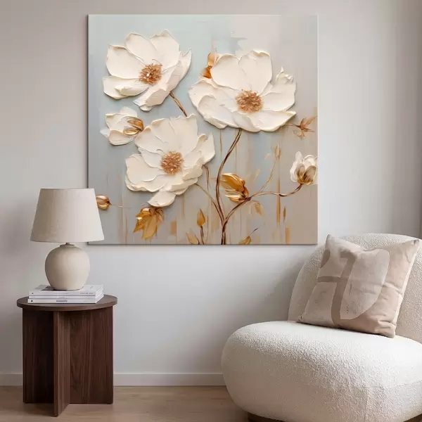 Wandbilder Reliefartige weiße Blüten mit warmen Blättern Art. s48093