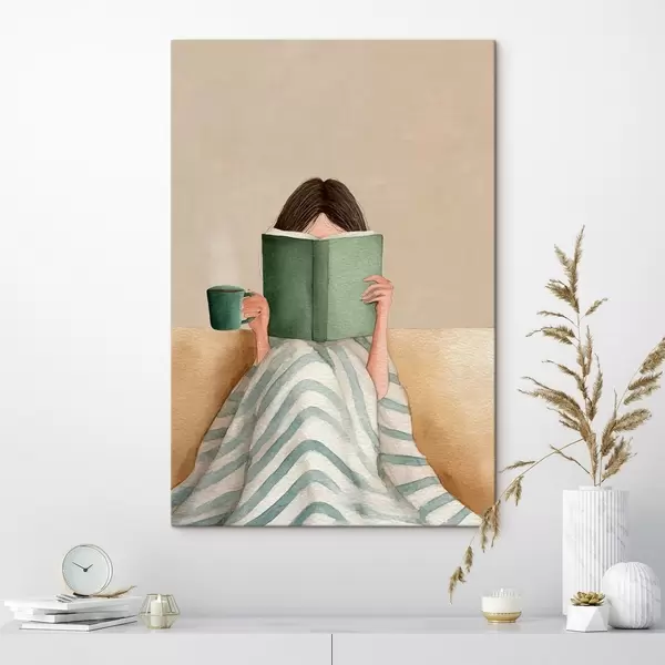 Wandbilder Weiche Aquarellillustration einer Frau, die auf einer Couch sitzt und ein Buch liest s48114