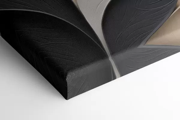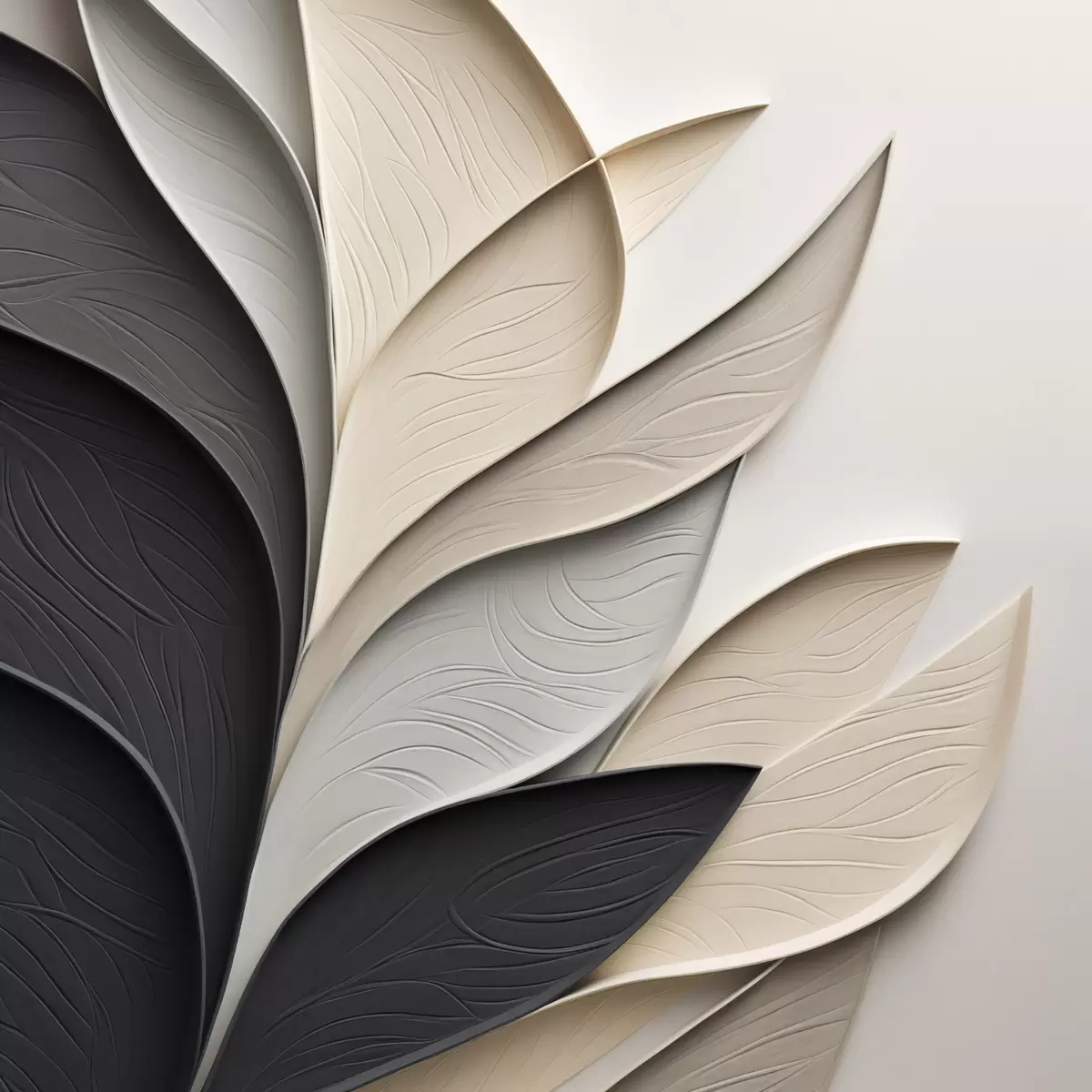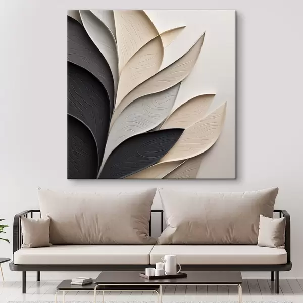 Wandbilder Abstrakte Komposition aus übereinanderliegenden Blättern, geschwungenen Formen in Schwarz, Weiß und Beige, strukturierte Kunst Art. s48382
