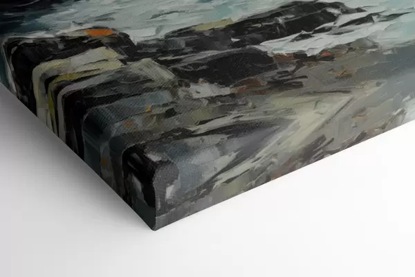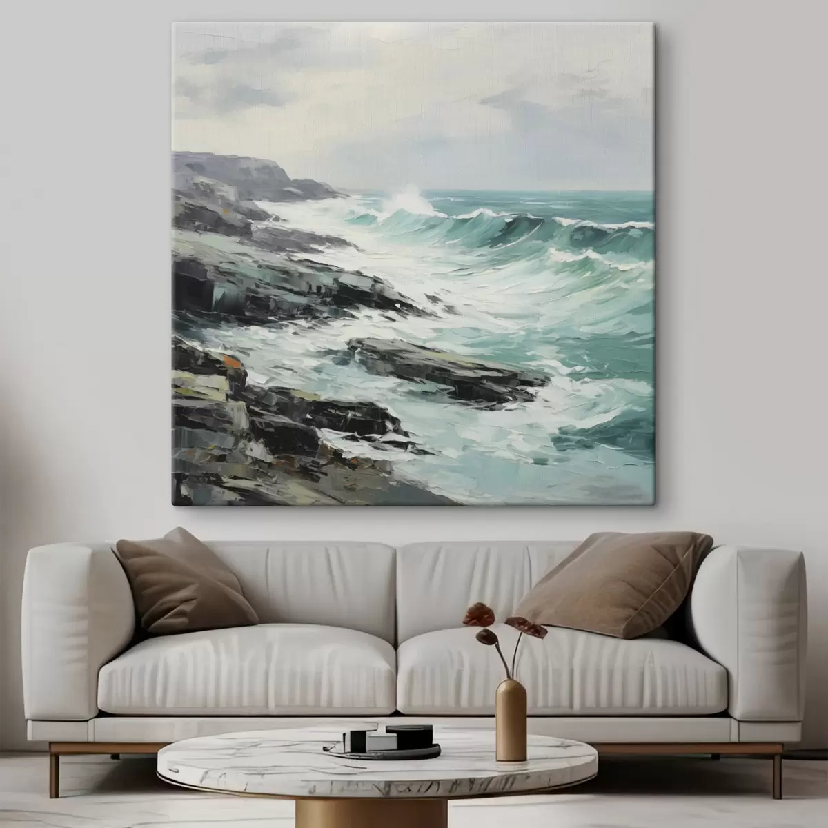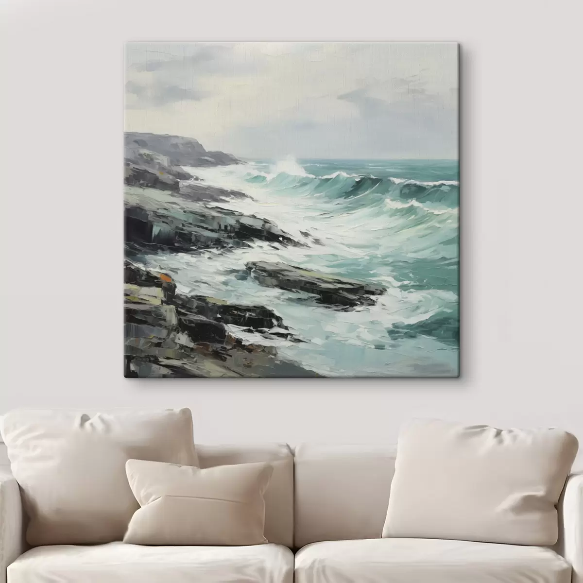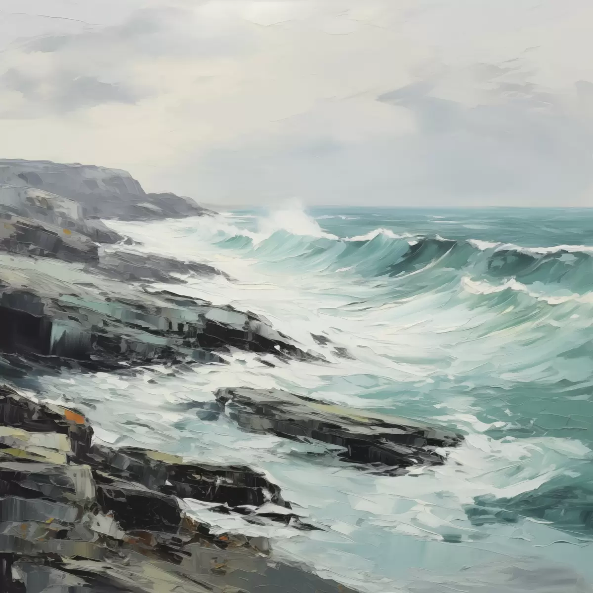Wandbilder Eine felsige Küstenlandschaft mit Wellen unter bewölktem Himmel, im Stil eines Gemäldes Art. s48387