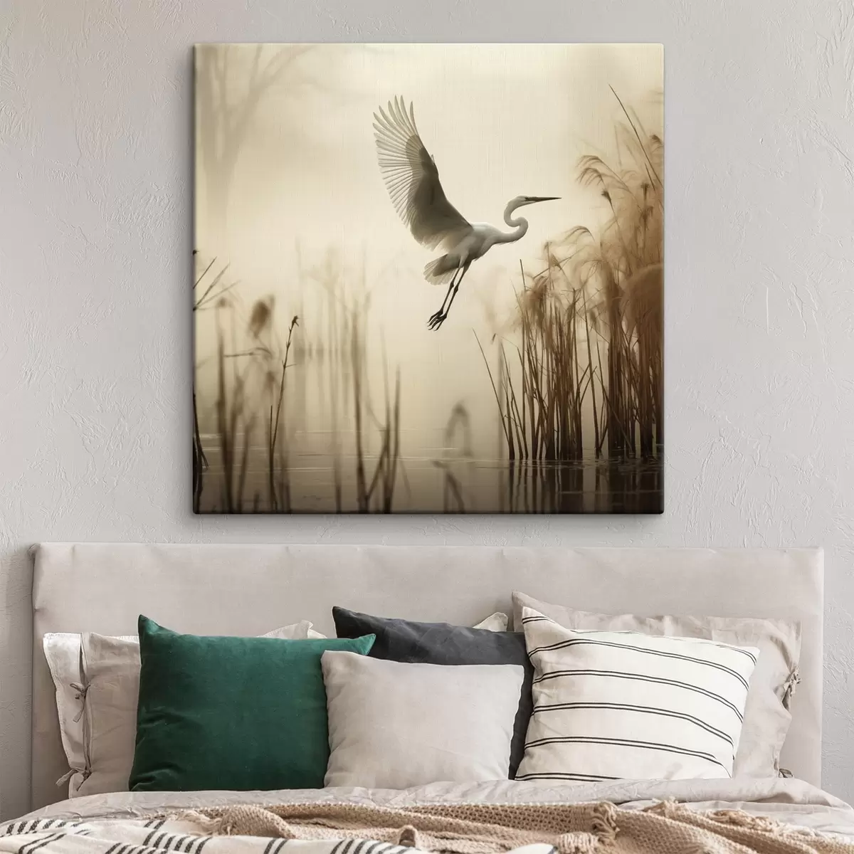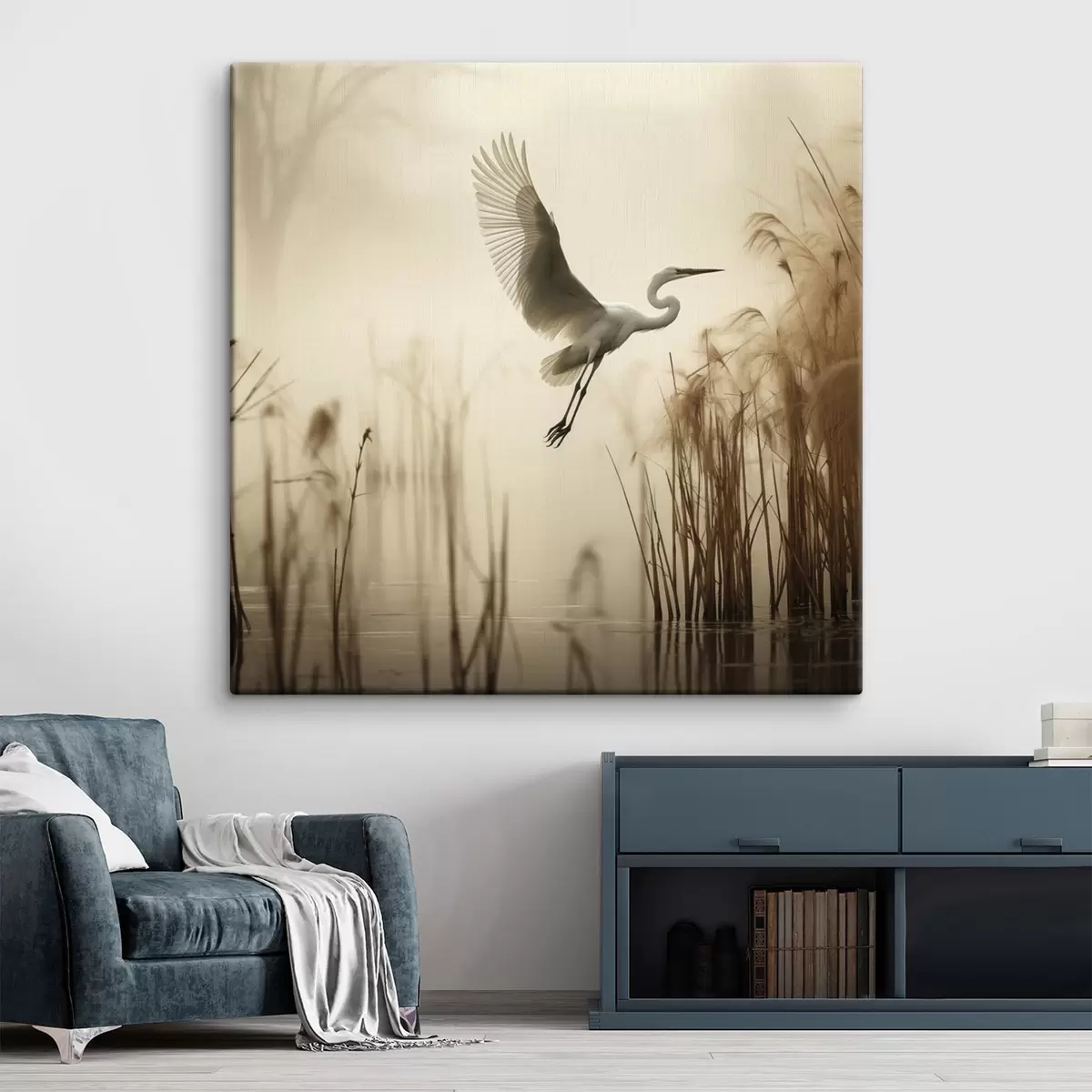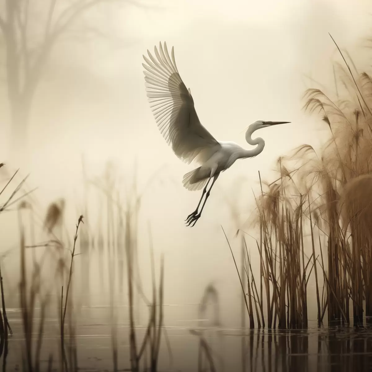 Wandbilder Ein Silberreiher fliegt über einen See, umgeben von hohem Schilf und Bäumen im Hintergrund Art. s48389