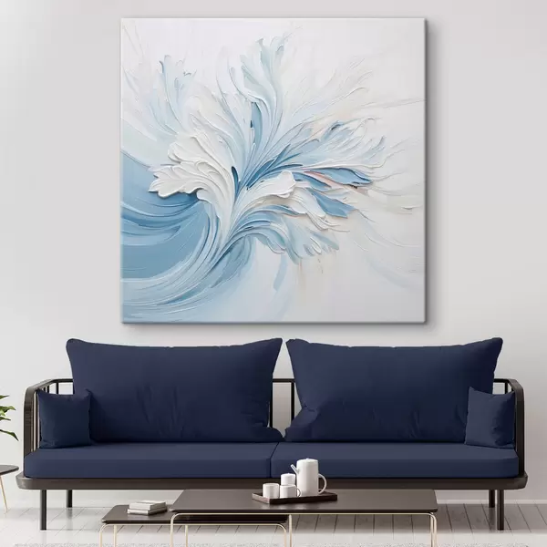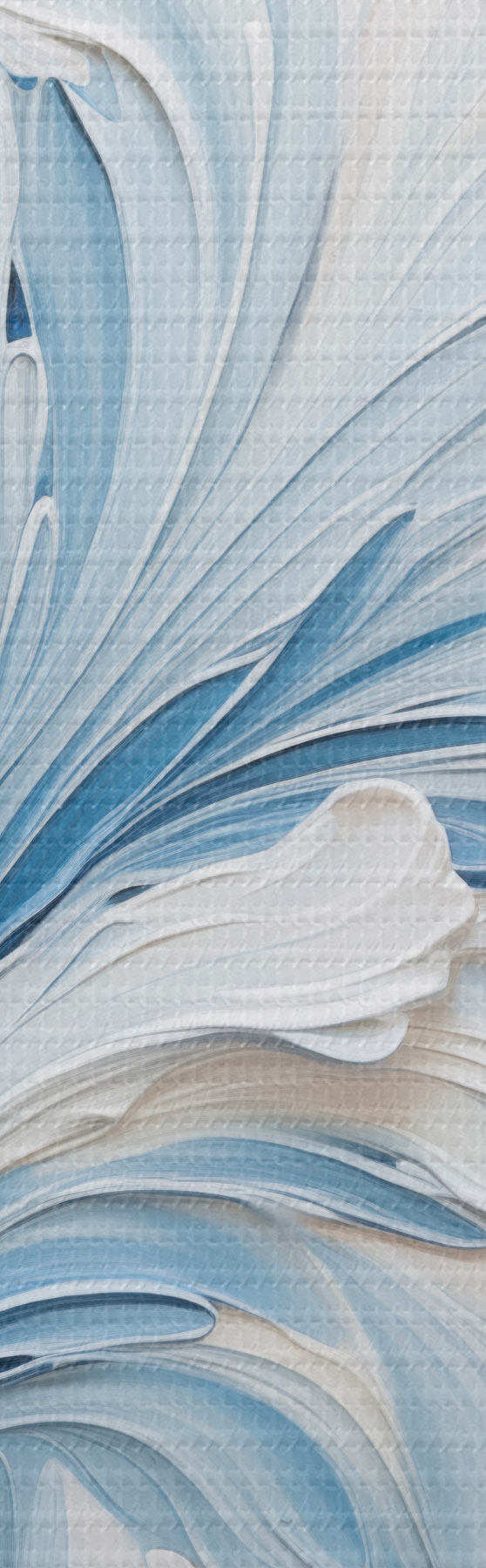 Wandbilder Ein abstraktes Blumenmuster in Weiß und Hellblau mit strukturierten Blütenblättern und geschwungenen Linien Art. s48395