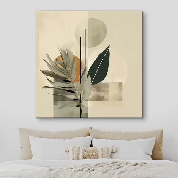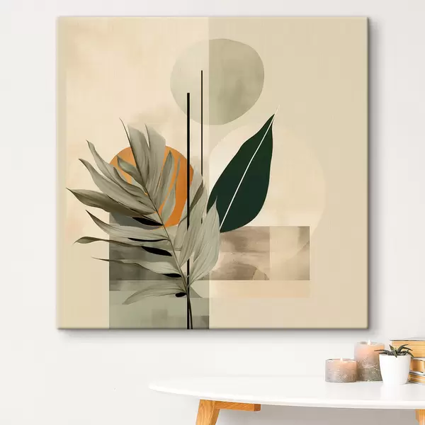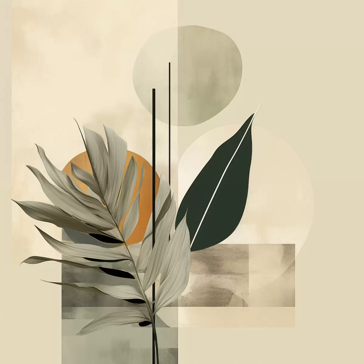 Wandbilder Eine dunkelgrüne Pflanze mit abstrakten geometrischen Formen und Aquarellstrukturen in Beige und Grün Art. s48410