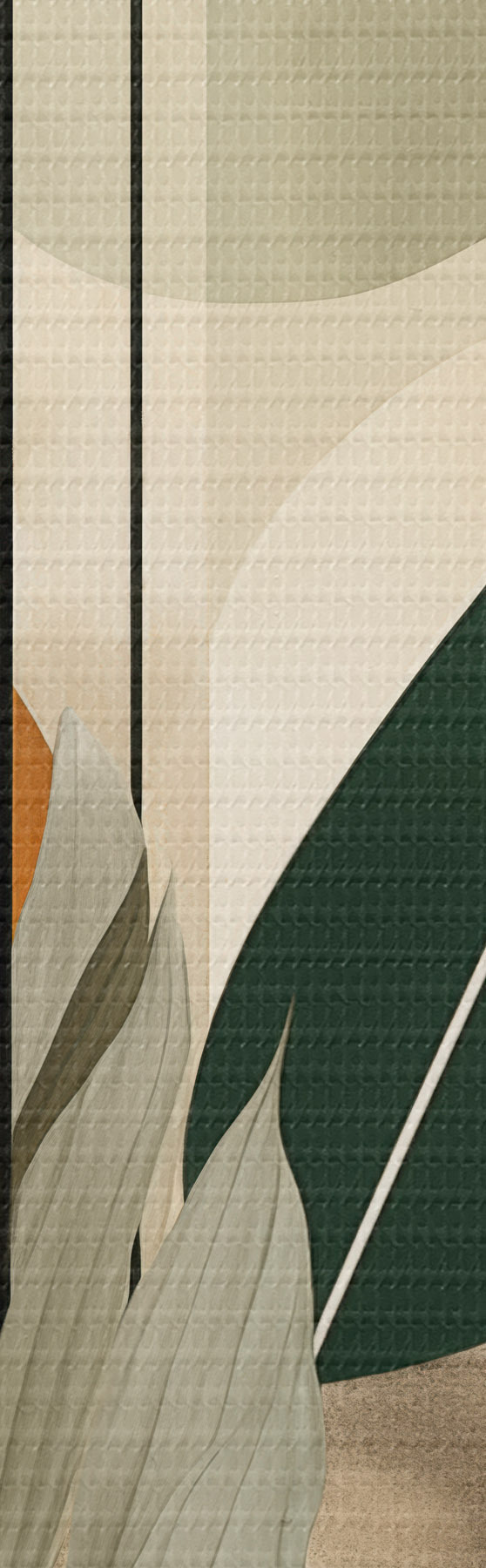 Wandbilder Eine dunkelgrüne Pflanze mit abstrakten geometrischen Formen und Aquarellstrukturen in Beige und Grün s48410