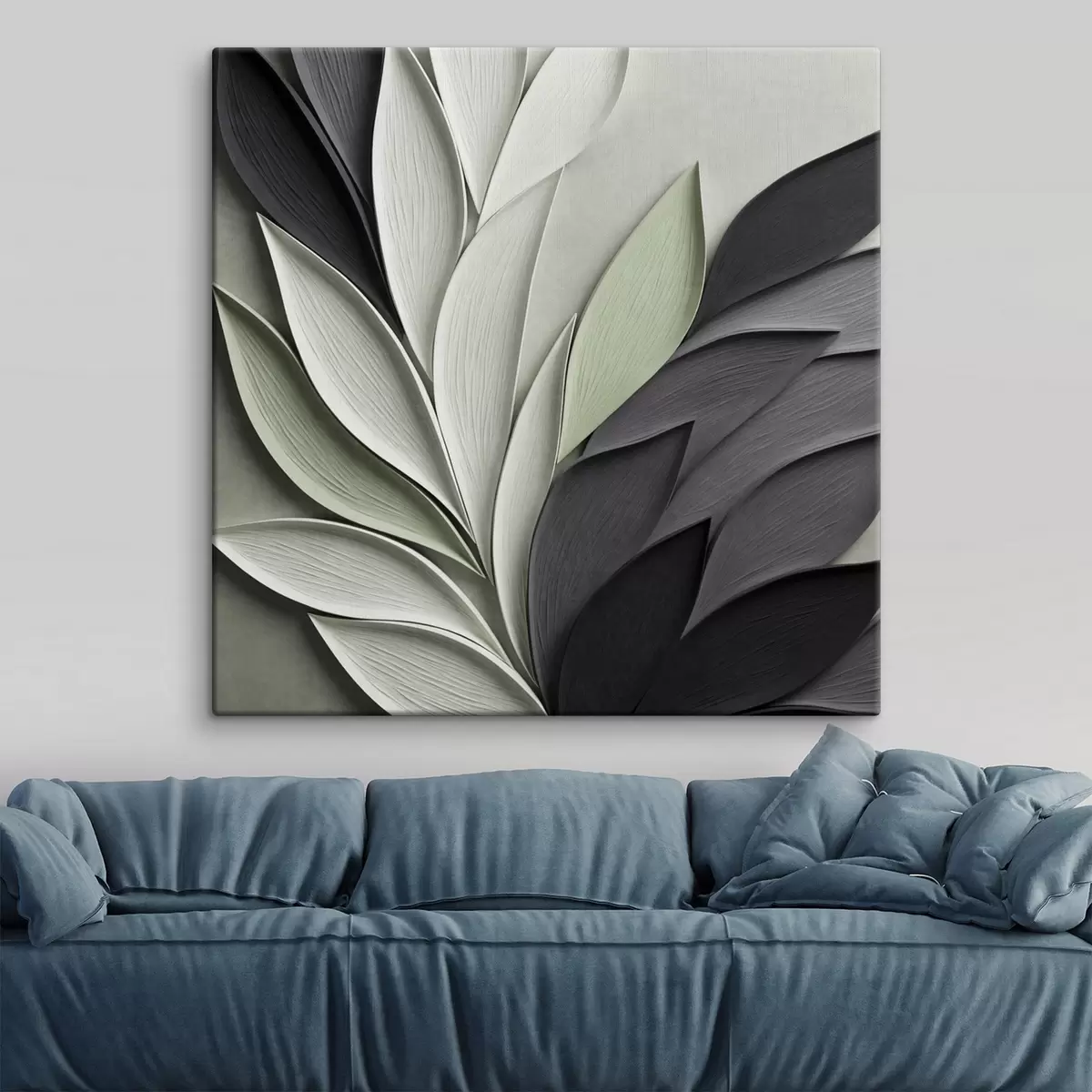 Wandbilder Abstrakte, stilisierte Blätter in Grau-, Weiß- und gedämpften Grüntönen Art. s48411