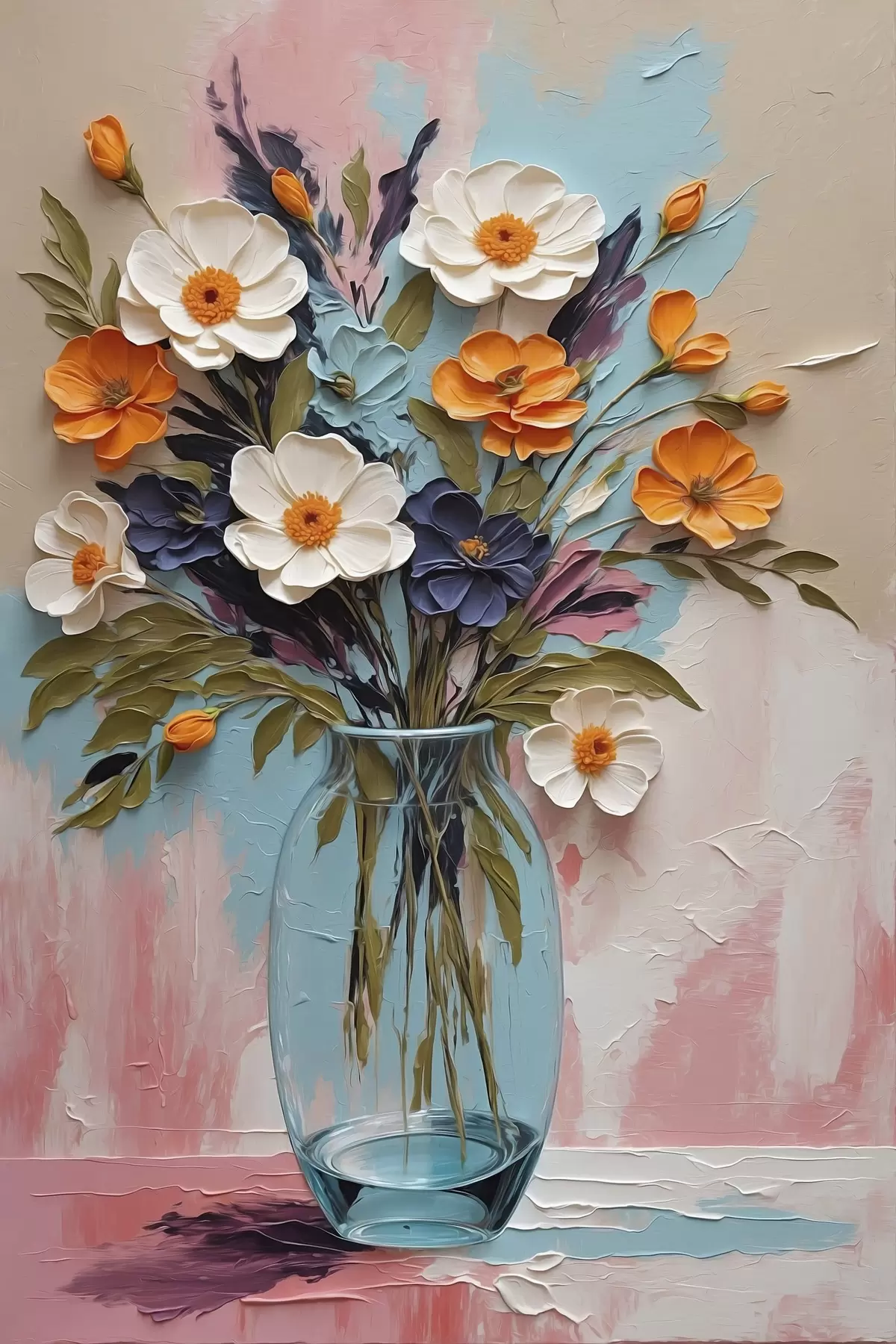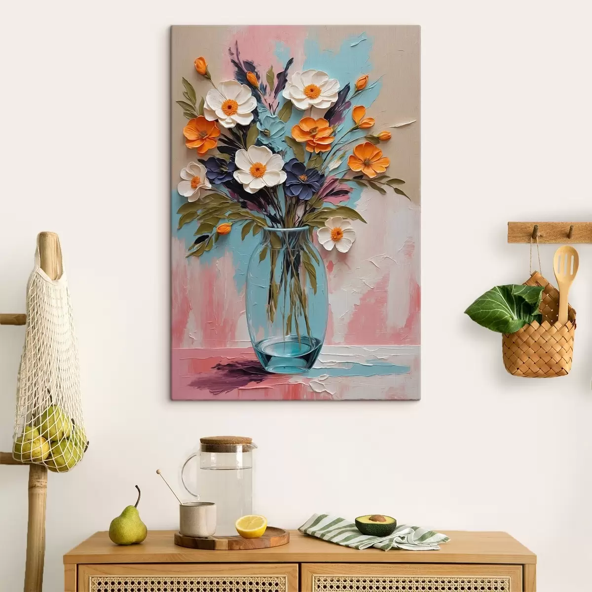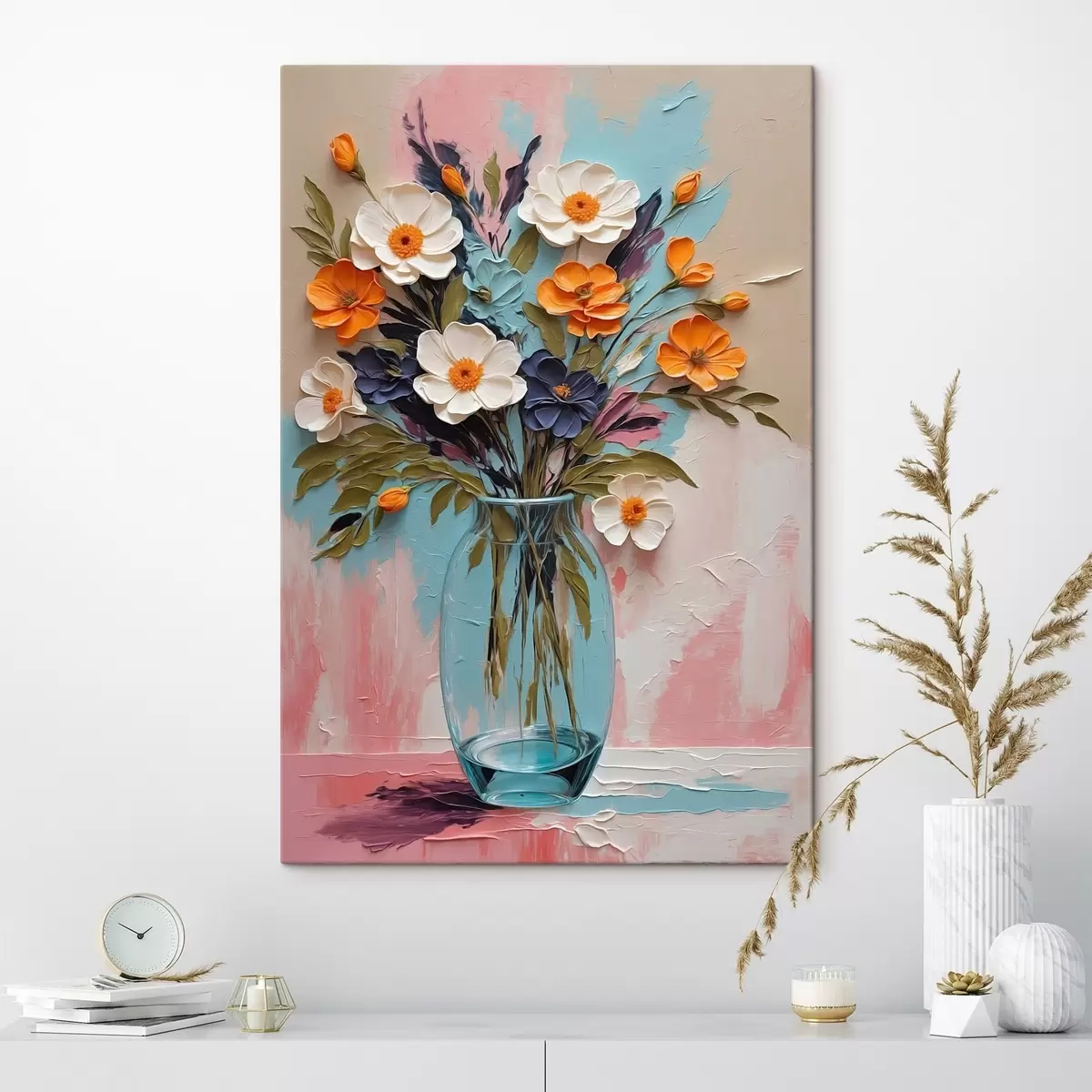 Wandbilder Blumenstrauß in einer Glasvase vor einem bunten Hintergrund Art. s48488