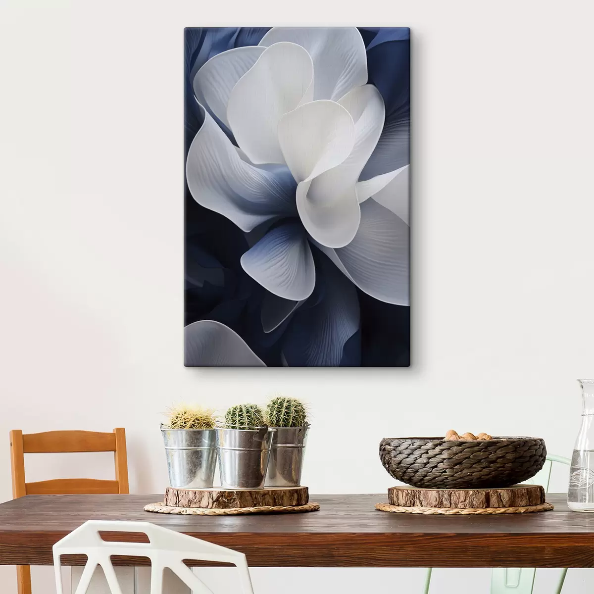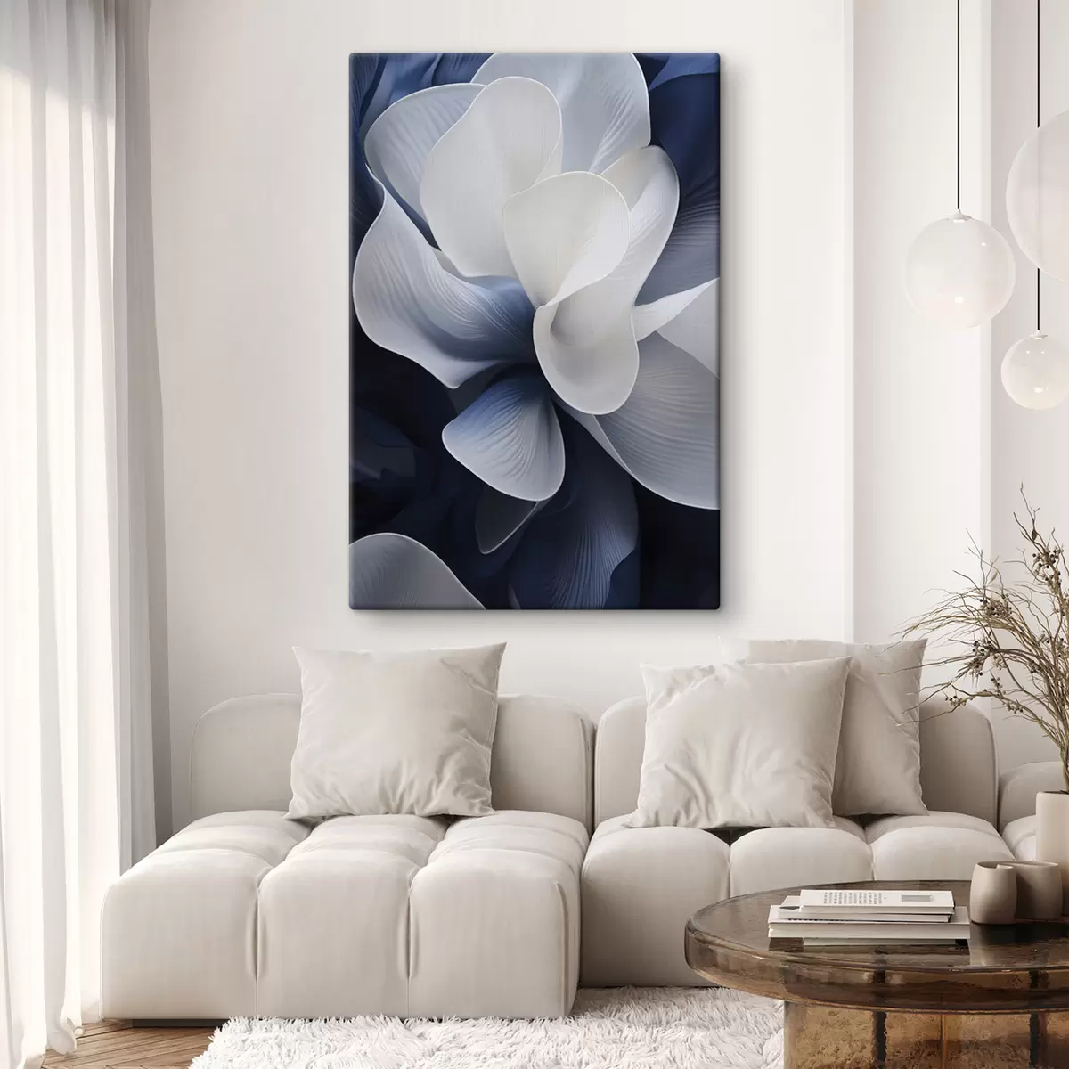 Wandbilder Abstrakte blau-weiße Blütenblätter vor dunklem Hintergrund Art. s48732