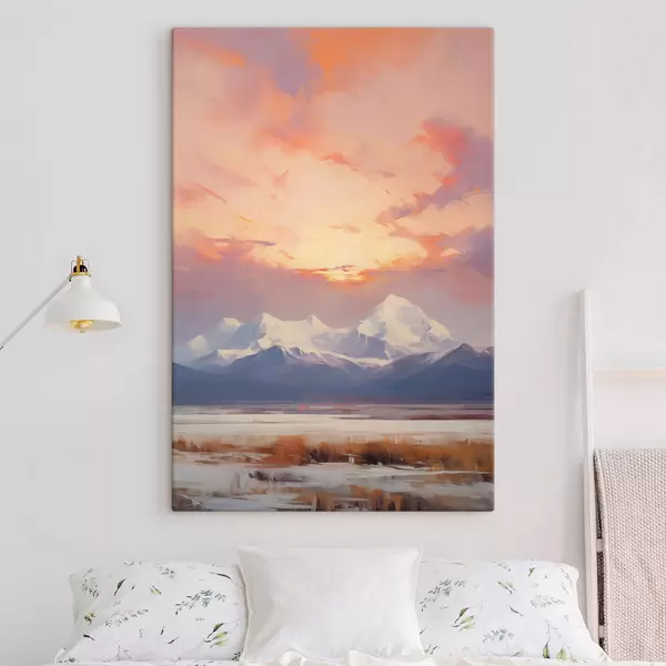 Wandbilder Schneebedeckte Berge unter einem leuchtend orange-rosa Himmel mit Wolken Art. s48742
