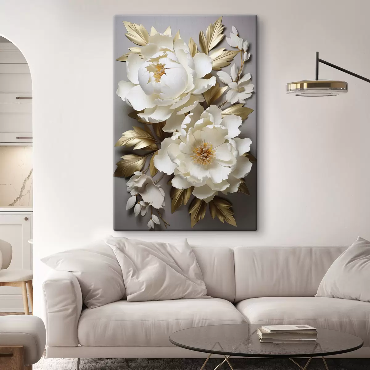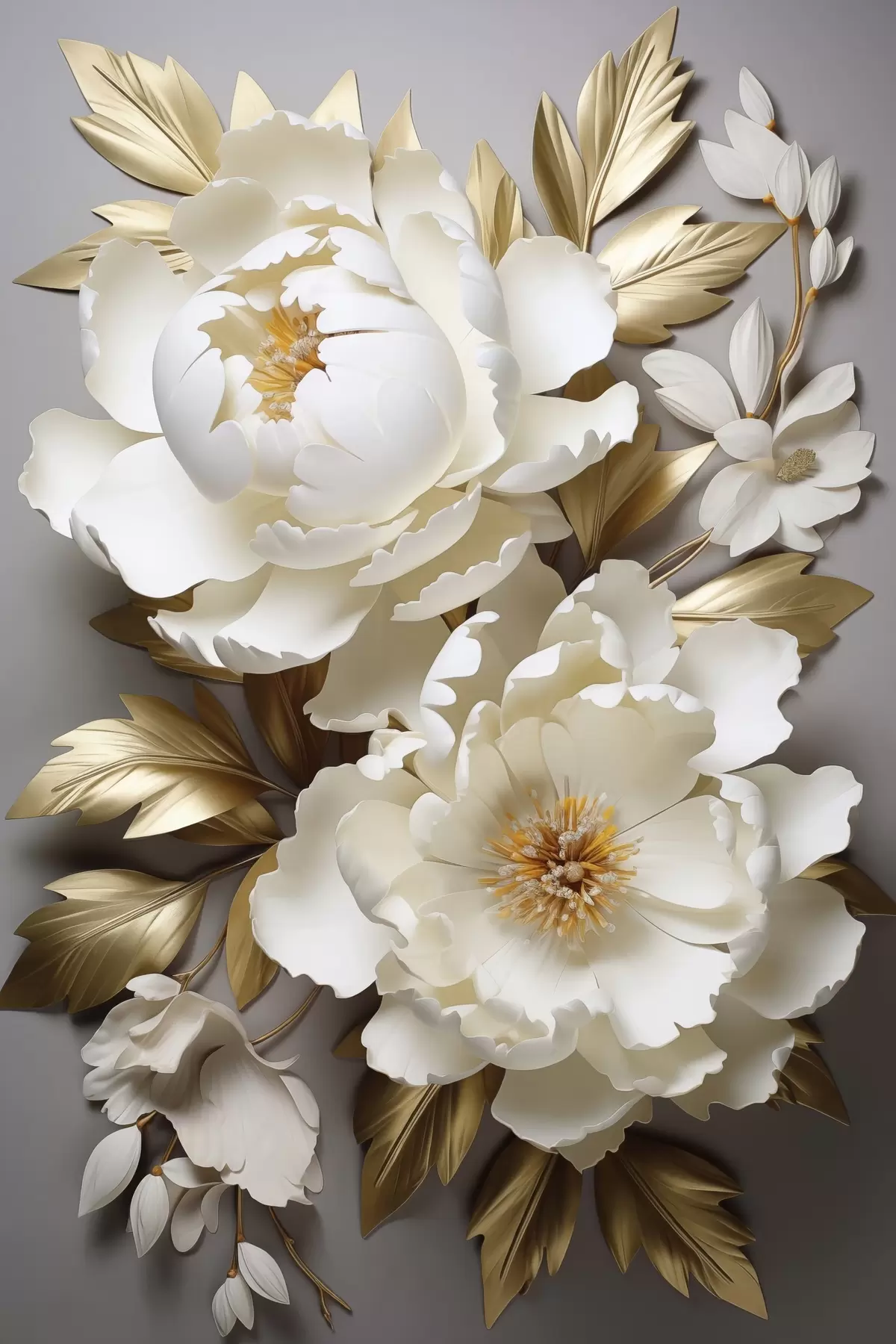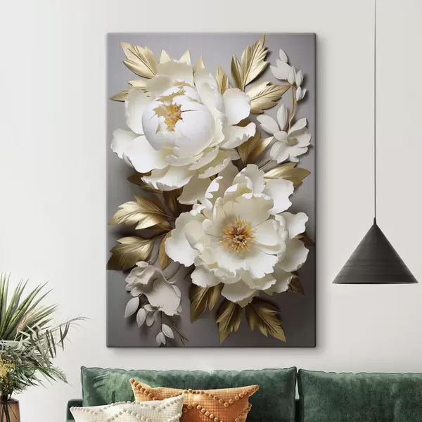 Wandbilder Große weiße Pfingstrosen mit gelben Blättern vor grauem Hintergrund Art. s48753