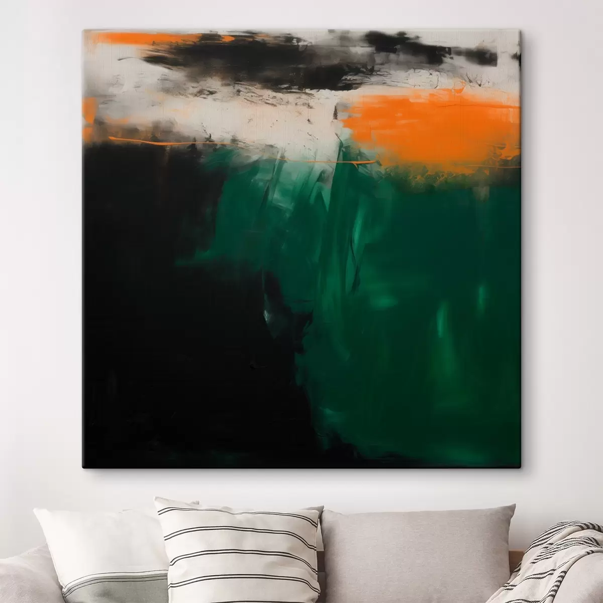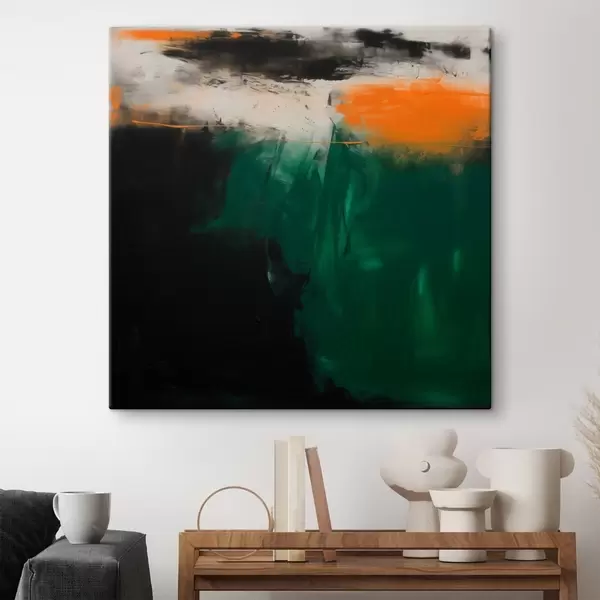 Wandbilder Abstraktion mit orangefarbenen Akzenten und tiefgrünen Pinselstrichen in einem zeitgenössischen Malstil Art. s48865