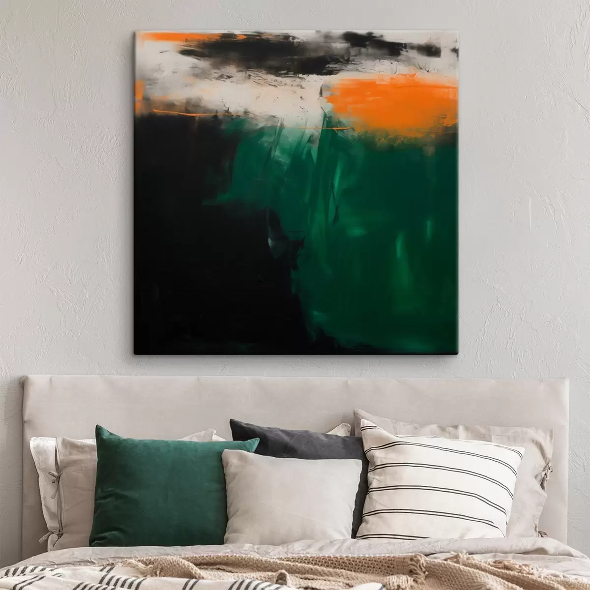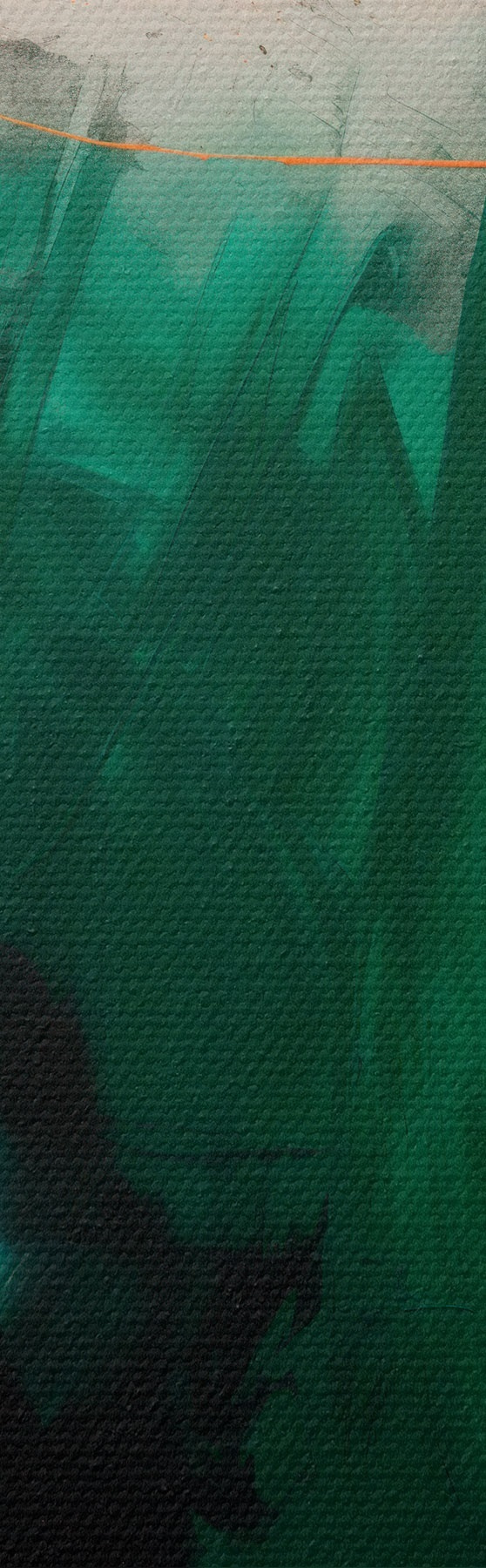 Wandbilder Abstraktion mit orangefarbenen Akzenten und tiefgrünen Pinselstrichen in einem zeitgenössischen Malstil s48865